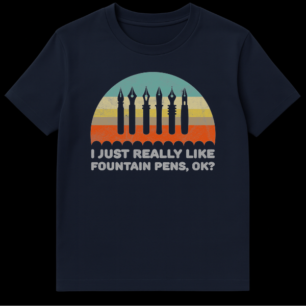 Declare your love for fine writing with this unique retro fountain pen t-shirt. Featuring distressed fountain pen nib silhouettes and the relatable phrase, “I JUST REALLY LIKE FOUNTAIN PENS, OK?”, it’s a stylish nod to your favorite hobby. Perfect for any fountain pen collector, writer, or enthusiast who appreciates a vintage aesthetic.
