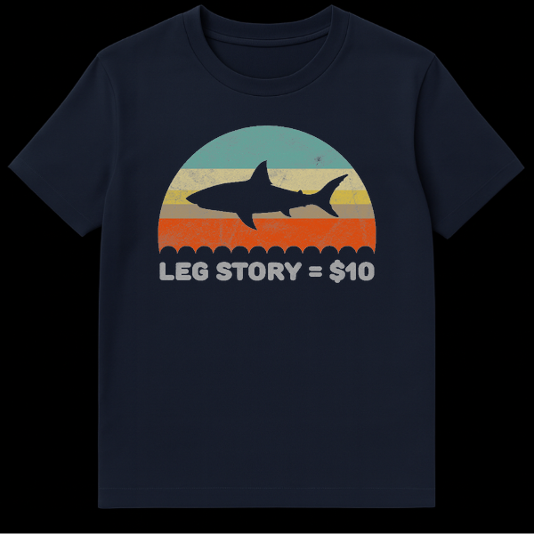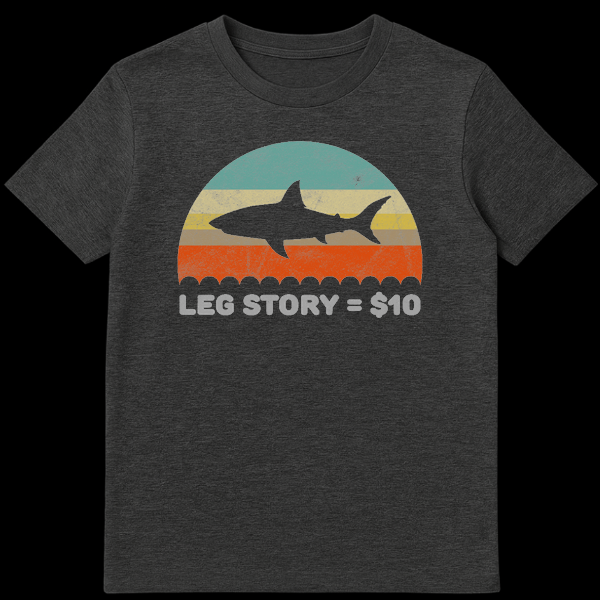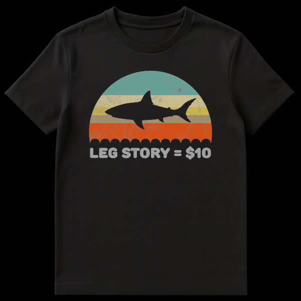 Embrace dark humor with this hilarious ‘Leg Story $10’ shark design, perfect for amputees tired of repetitive questions. Featuring a retro-style shark silhouette, this shirt turns an awkward conversation starter into a profitable joke. It is the ultimate gag gift for shark attack survivors, prosthetic leg users, or anyone recovering from limb loss who loves sarcasm.
