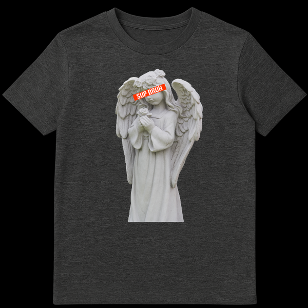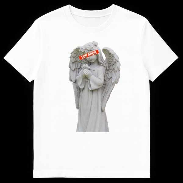 Elevate your casual wardrobe with this unique blend of sacred art and street slang. This design features a beautifully detailed grey stone angel statue, complete with feathered wings and a flower crown, striking a traditional pose of prayer. However, the vibe is instantly flipped by a bold red censor bar over her eyes that reads ‘SUP BRUH’ in white block letters. This hilarious juxtaposition transforms a solemn figure into a chill, modern character, making it a standout piece for anyone who appreciates internet irony. It makes a fantastic gift for teenagers, college students, meme enthusiasts, and anyone who enjoys funny, edgy streetwear. Wear it to parties, casual hangouts, or just to confuse your art teacher.