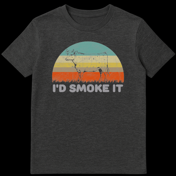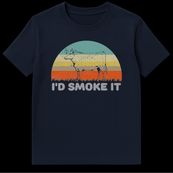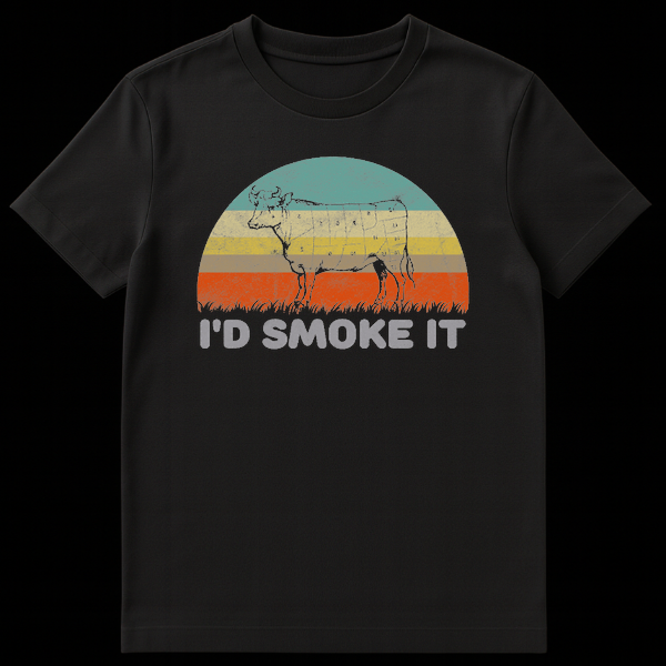 Embrace the art of the smoke with our “I’d Smoke It” BBQ t-shirt, the ultimate apparel for backyard pitmasters and grilling enthusiasts. This eye-catching design features a detailed silhouette of a cow marked with traditional butcher cuts—from brisket to ribeye—set against a cool, muted retro sunset of teal, cream, and burnt orange. The distressed, vintage texture gives it that perfectly worn-in look right out of the box. The humorous caption, “I’d Smoke It,” is a cheeky nod to the dedication required for perfect barbecue, making it a guaranteed conversation starter at your next cookout. Whether you’re manning the offset smoker for twelve hours or just flipping burgers on the weekend, this shirt shows off your culinary expertise with style. It is the perfect Father’s Day gift, birthday present for a chef, or a treat for the carnivore in your life who knows their way around a brisket.