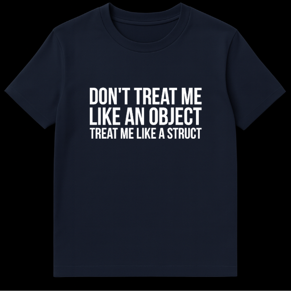 Show off your coding knowledge with this hilarious developer shirt featuring the phrase “Don’t Treat Me Like An Object, Treat Me Like A Struct.” This design plays on the difference between complex, encapsulated objects and simple, public structs in languages like C and C++. It makes a perfect gift for software engineers, computer science students, and anyone who prefers their data public and accessible.