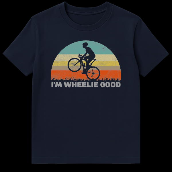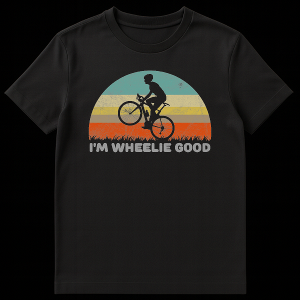 Pedal into style with our ‘I’m Wheelie Good’ t-shirt, a must-have for every cycling enthusiast with a sense of humor. This eye-catching design centers around a classic retro sunset in distressed teal, beige, yellow, and orange hues, creating a nostalgic 80s vibe. Silhouetted against this backdrop is a skilled cyclist performing an impressive wheelie, perfectly illustrating the pun below. The bold text playfully twists the phrase ‘really good’ into ‘wheelie good,’ making it an instant conversation starter at the bike park or on the trails. Whether you are a mountain biker, a road cyclist, or just love performing tricks, this shirt celebrates your passion with wit. It is an ideal gift for birthdays, Father’s Day, or just to surprise the bike lover in your life.