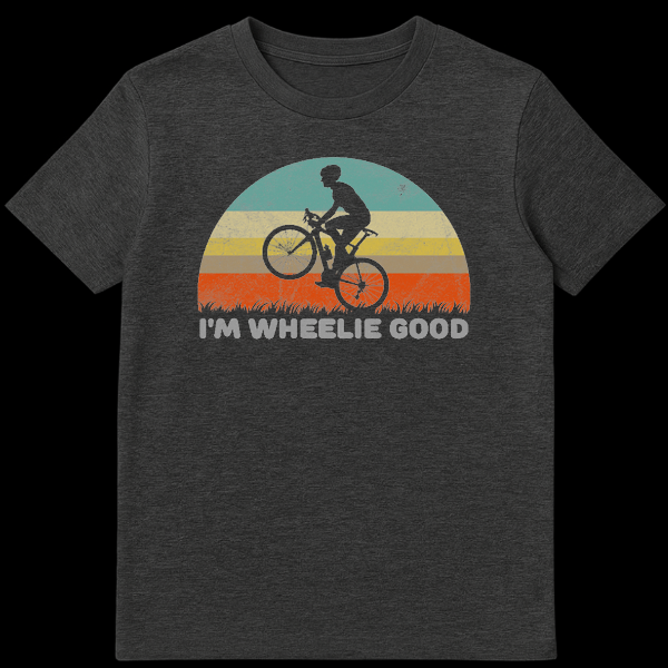 Show off your cycling skills with this hilarious ‘I’m Wheelie Good’ t-shirt. Featuring a retro striped sunset and a silhouette of a biker popping a wheelie, this design perfectly blends vintage aesthetics with clever wordplay. It makes the perfect gift for mountain bikers, BMX riders, and anyone who loves a good dad joke while out on a ride.