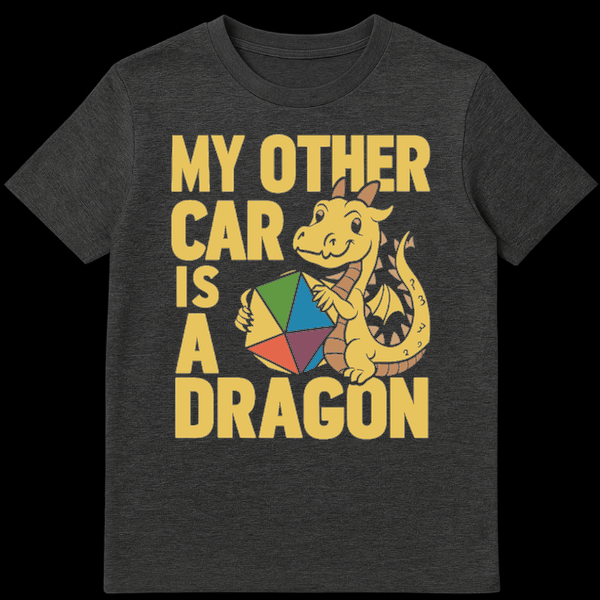 Level up your wardrobe with this hilarious tabletop gaming tee featuring a friendly yellow dragon clutching a colorful d20 die. The distressed text “My Other Car Is A Dragon” adds a fantasy twist to a classic bumper sticker joke, proclaiming your love for role-playing adventures. This design is the perfect gift for Dungeon Masters and RPG players who prefer riding mythical creatures to driving sedans.