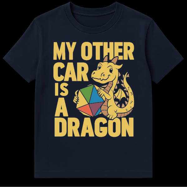 Embrace your inner adventurer with this witty “My Other Car Is A Dragon” design, tailor-made for fans of tabletop role-playing games. Perfectly capturing the spirit of fantasy gaming, this graphic highlights a cute, cartoonish yellow dragon hugging a large, multi-colored icosahedron die. The bold, distressed vintage-style typography adds a rugged charm, while the clever parody of the classic car bumper sticker implies that while you may be commuting in the real world, your imagination is soaring on dragonback. Whether you are rolling for initiative or stuck in traffic, this shirt lets everyone know where your true passion lies. It makes an excellent gift for the Dice Goblin, Dungeon Master, or fantasy geek in your life who loves critical hits and legendary creatures.