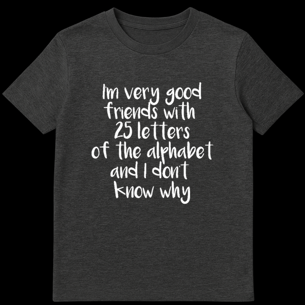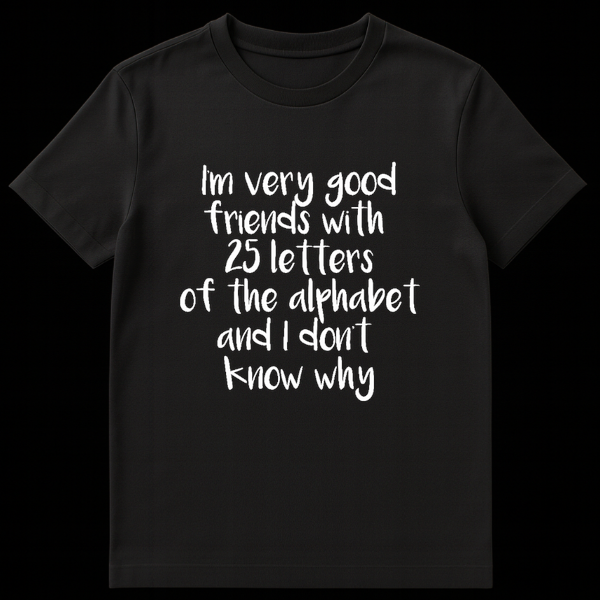 Show off your wit with this clever alphabet pun design that highlights the confusion between the word “why” and the letter “Y.” Featuring the text “I’m very good friends with 25 letters of the alphabet and I don’t know why,” this graphic delivers a classic dad joke punchline. It makes a perfect gift for English teachers, writers, grammar nerds, and anyone who loves a groan-worthy play on words.