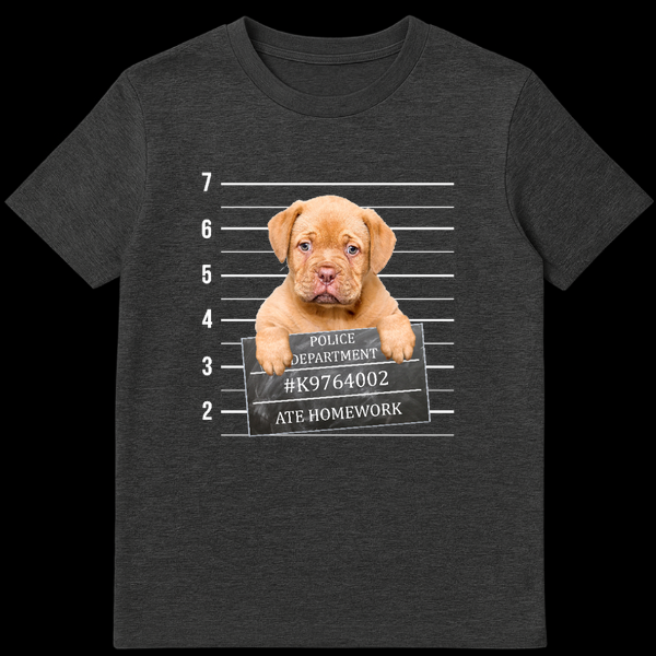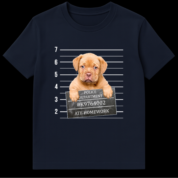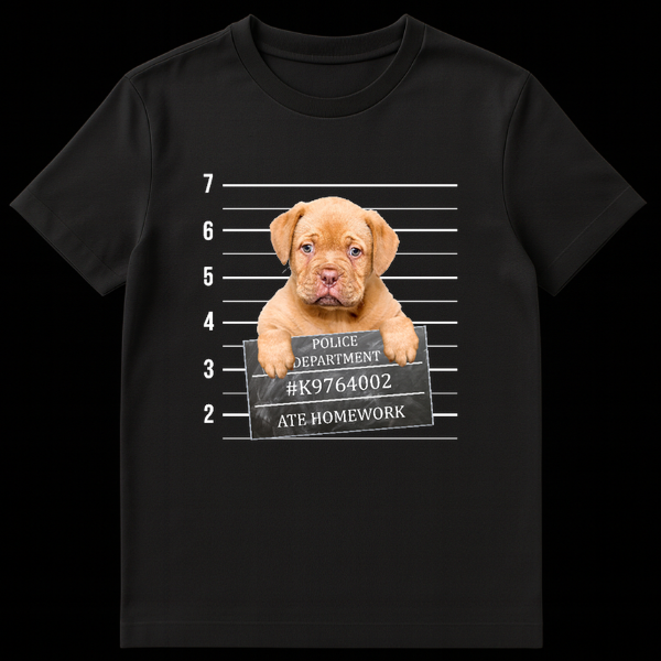 Capture the hilarity of the ultimate student excuse with this adorable puppy mugshot design. Featuring a guilty-looking Dogue de Bordeaux holding a police placard that reads “ATE HOMEWORK,” this graphic puts a playful spin on canine mischief. It makes a perfect, laugh-out-loud gift for students, teachers, or any dog lover who knows the struggle of a naughty pup.