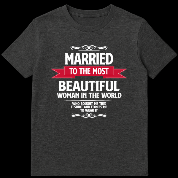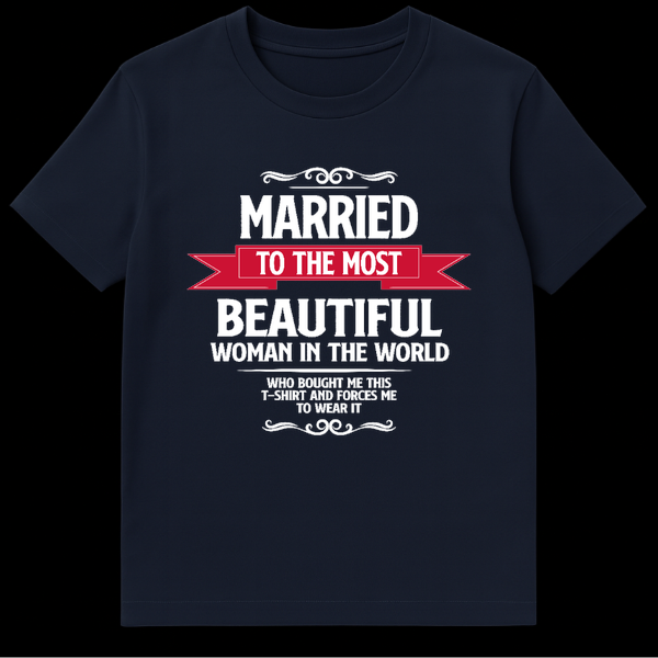 Surprise your hubby with the ultimate marriage prank! This design is masterfully crafted to deceive onlookers. From a distance, the large, elegant serif typography and festive red banner proudly declare, “Married to the most beautiful woman in the world.” It looks like a sweet, sentimental gesture. However, as people get closer, they’ll spot the tiny sans-serif punchline at the bottom: “Who bought me this t-shirt and forces me to wear it.” It’s the perfect blend of romance and sarcasm. This shirt makes an excellent anniversary gift, Valentine’s Day surprise, or just a random Tuesday prank for the man who knows who is really the boss. The ornamental swirls add a touch of class to this cheeky graphic, ensuring he looks good while being hilariously honest about his wardrobe choices.