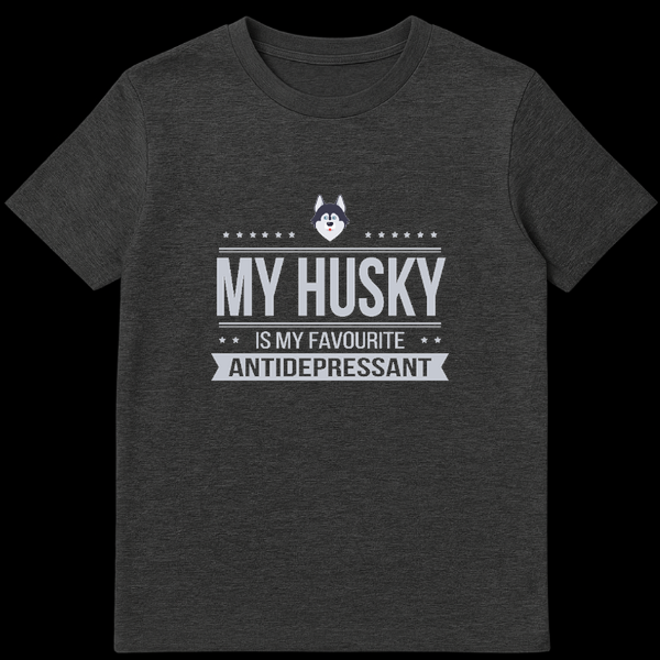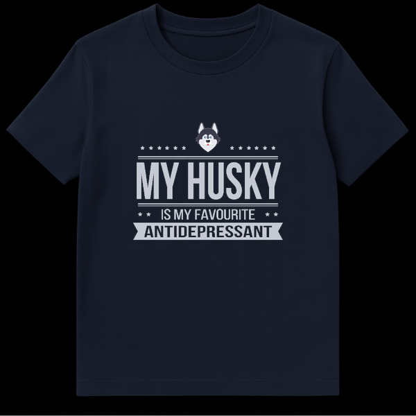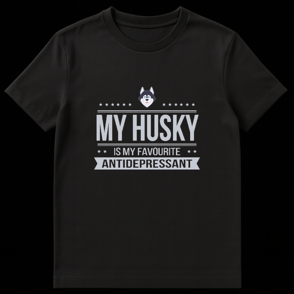 Celebrate the joy your Siberian Husky brings with this heartwarming design featuring a cute cartoon dog head. The text ‘My Husky Is My Favourite Antidepressant’ humorously highlights how pets improve our mental health and happiness. This typography-based graphic makes a hilarious and thoughtful gift for dog owners who rely on their furry therapy. Perfect for wearing on walks or at the dog park to show your appreciation.