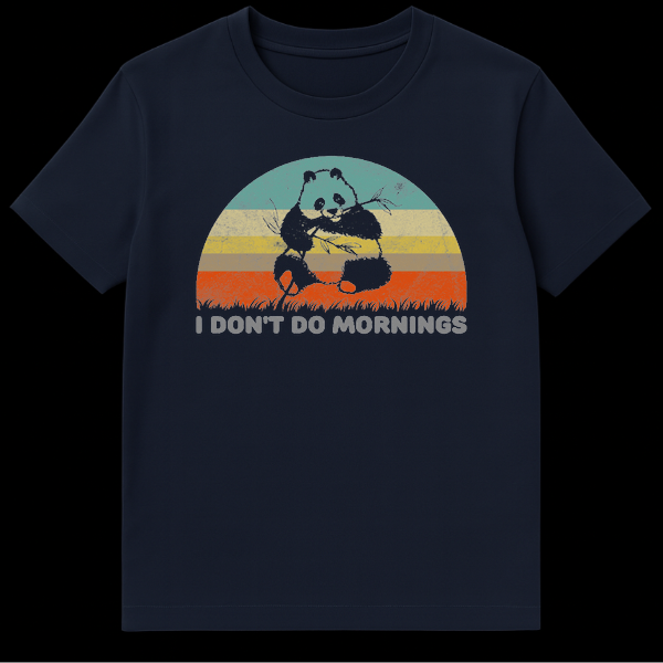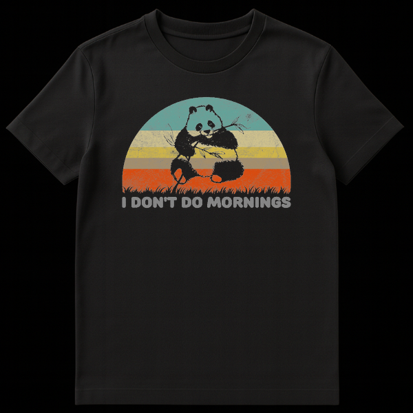 Embrace your inner night owl with this hilarious panda graphic tee, featuring a cute giant panda munching bamboo against a vintage sunset. The witty slogan ‘I Don’t Do Mornings’ perfectly captures the struggle of waking up early, making it a relatable favorite for sleepyheads. With its distressed grunge texture and muted retro colors, this design adds a cool, worn-in aesthetic to your casual wardrobe. It makes an excellent gift for animal lovers, coffee addicts, and anyone who needs a little extra time before facing the day.