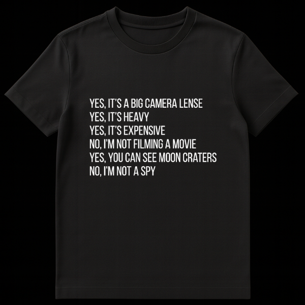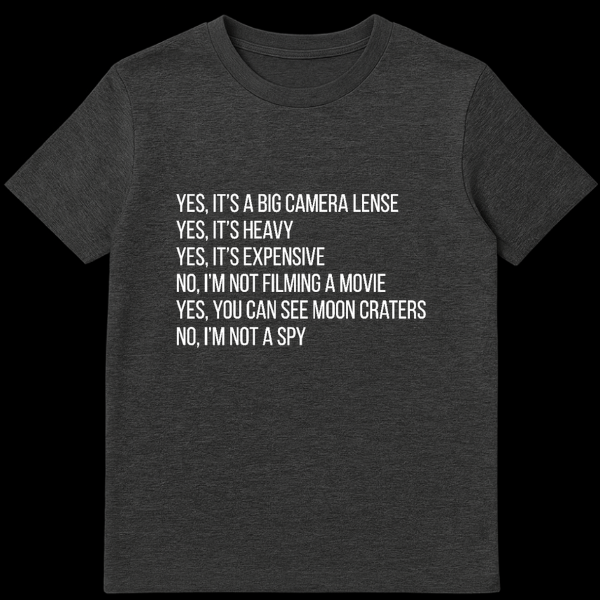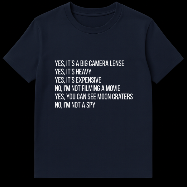 Capture laughs instead of just photos with this hilarious ‘Big Camera Lens FAQ’ T-shirt. Designed specifically for serious photographers who know the struggle of carrying massive telephoto lenses in public, this design preemptively answers every annoying question strangers ask. From confirming that ‘Yes, it’s heavy’ and ‘Yes, it’s expensive,’ to clarifying that ‘No, I’m not a spy,’ this shirt does the talking so you can focus on the shot. The bold, easy-to-read text mimics a checklist, making it a witty conversation starter—or stopper! This makes an ideal gift for wildlife photographers, sports photojournalists, bird watchers, and camera gear enthusiasts who appreciate a bit of snark with their shutter speed. Wear it on your next shoot and save your breath for the hike.
