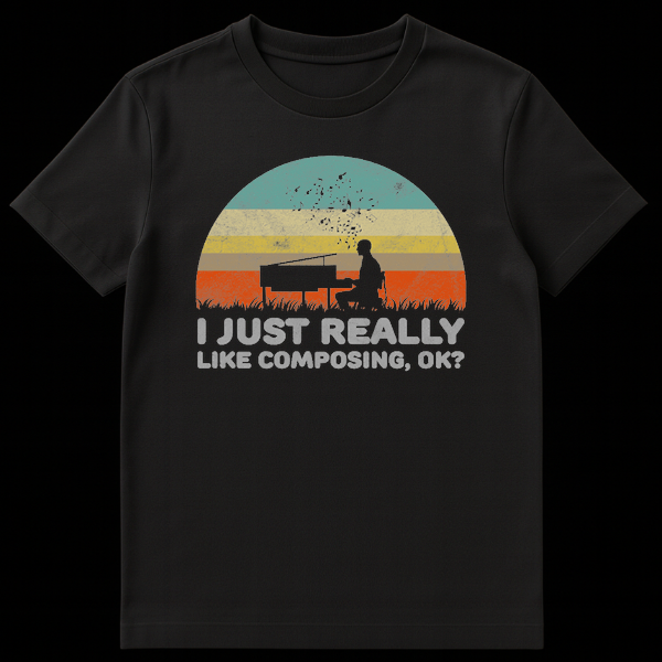 Celebrate your musical obsession with this witty retro-style design featuring a silhouetted pianist against a vintage sunset. The bold text, “I Just Really Like Composing, Ok?” perfectly captures the passion of dedicated musicians and song writers. It’s the ideal humorous gift for music theory students, piano teachers, and anyone who spends hours at the keys.