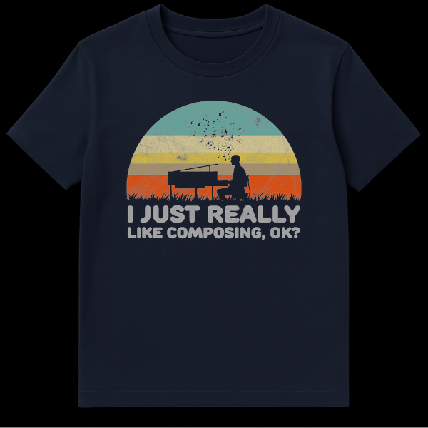 Are you the type of person who starts humming melodies in the middle of a conversation? Do you dream in musical notation? Then this is the perfect shirt for you. This vintage-inspired design showcases a classic grand piano silhouette set against a distressed retro sunset in teal, cream, yellow, and orange hues. Floating musical notes add a touch of whimsy, while the distressed text “I Just Really Like Composing, Ok?” delivers a funny, defensive punchline that every creative artist understands. It’s a fantastic conversation starter for recitals, band practice, or just lounging at home. Whether you are shopping for a classical pianist, a jazz enthusiast, or a music composition major, this tee makes a thoughtful and relatable gift.
