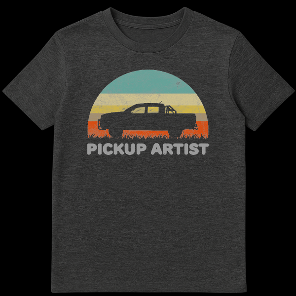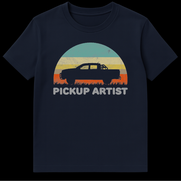 Are you a true master of the haul? This ‘Pickup Artist’ T-Shirt is the ultimate apparel for anyone who prefers diesel engines over cheesy dating advice. The design features a classic retro aesthetic with a distressed, vintage-style sunset in stripes of teal, beige, mustard, and orange, perfectly framing a bold silhouette of a four-door pickup truck. The text ‘PICKUP ARTIST’ adds a layer of wit, turning a common dating phrase into a badge of honor for truck drivers, mechanics, and 4×4 enthusiasts. Whether you are heading off-road, working in the garage, or just love the truck lifestyle, this shirt combines comfort with a statement that is sure to get a laugh at the car meet. It is an excellent gift idea for dad, grandpa, or that friend who is always talking about their rig.