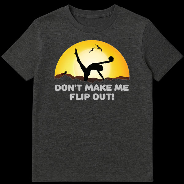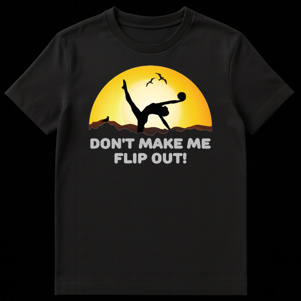 Express your passion for rhythmic gymnastics with this stunning silhouette design. Featuring a graceful gymnast balancing against a vibrant sunset with the humorous phrase “Don’t Make Me Flip Out!”, this tee perfectly combines athletic beauty with a witty pun. It’s the ideal gift for gymnasts, coaches, and anyone who loves acrobatics and a good laugh.