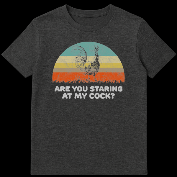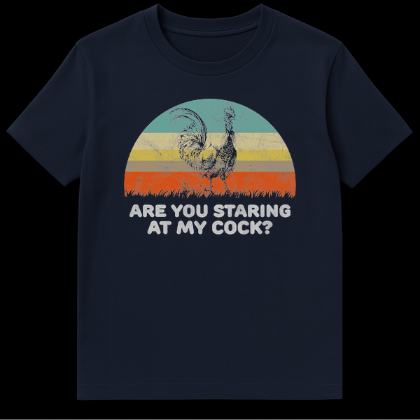 Embrace your cheeky side with our Funny Rooster Pun T-Shirt, a design that masterfully blends vintage aesthetics with bold barnyard humor. This shirt features a striking silhouette of a rooster standing proud against a distressed, 80s-style retro sunset, creating a cool, nostalgic vibe. Below the graphic, the text ‘Are You Staring At My Cock?’ delivers a punchy double entendre that is guaranteed to get a reaction. Whether you are a farmer proud of your poultry, a fan of edgy comedy, or just looking for the ultimate ice-breaker at a party, this shirt is for you. It makes a fantastic gift for dads, brothers, or that friend who loves inappropriate jokes. Wear it to the local dive bar, a casual BBQ, or just around the house to assert your dominance in the coop.