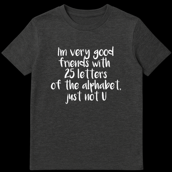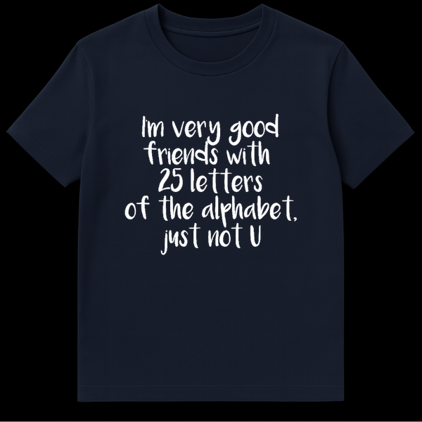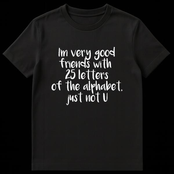 Unleash your inner sass master with our “I’m very good friends with 25 letters of the alphabet, just not U” graphic tee. This design features a clever textual layout that delivers the ultimate subtle roast, using the alphabet to tell someone exactly how you feel about them without losing your cool. Crafted for comfort and style, this shirt is the ultimate conversation starter for parties or casual hangouts where you want to establish your boundaries with humor. It makes a fantastic gift for English majors, sarcastic friends, or that coworker who appreciates a sharp wit. Wear your attitude proudly and let the alphabet do the talking with this witty, sarcastic masterpiece.