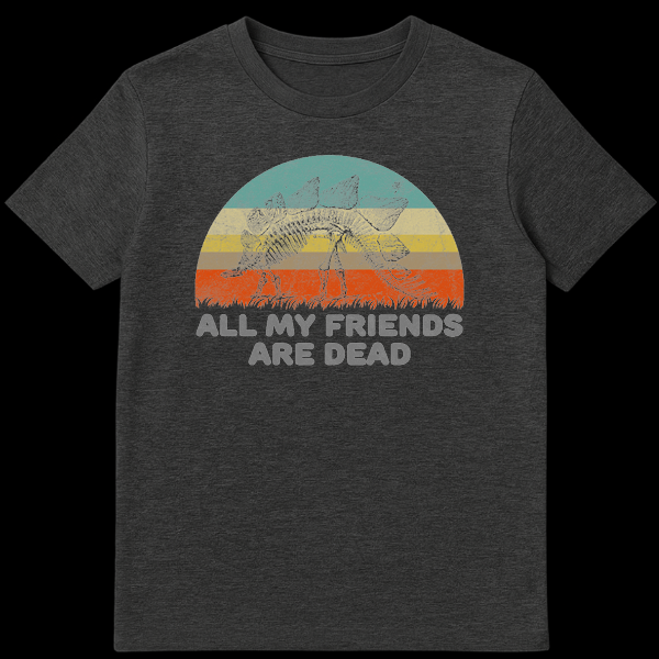 Embrace your inner emo fossil with this hilarious ‘All My Friends Are Dead’ Stegosaurus tee. Featuring a cool skeletal dinosaur walking against a distressed retro sunset, this design perfectly blends dark humor with vintage aesthetics. It’s the ultimate gift for introverts, goth kids, and paleontology lovers with a dry sense of humor.