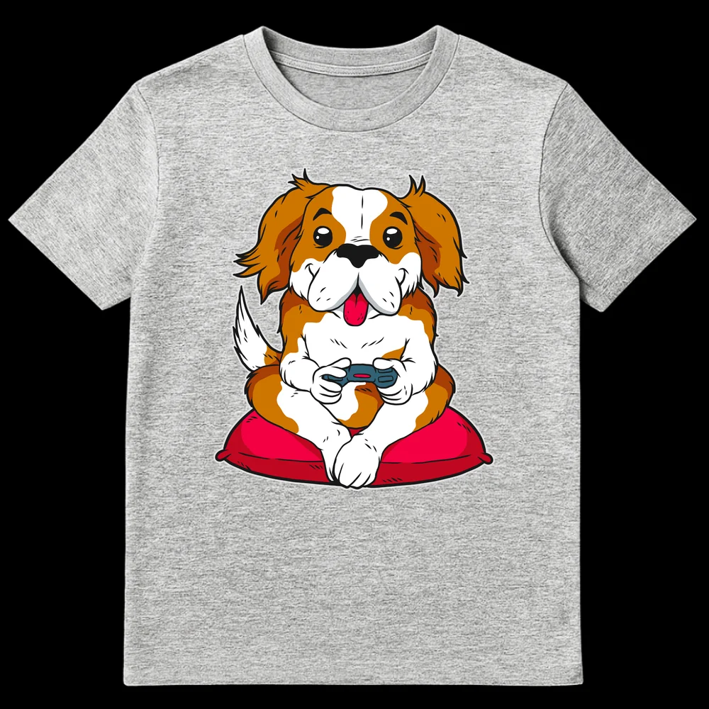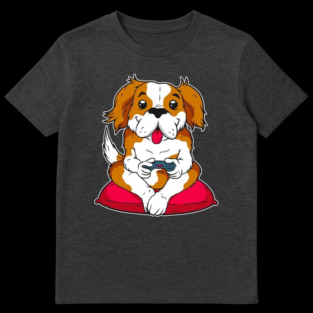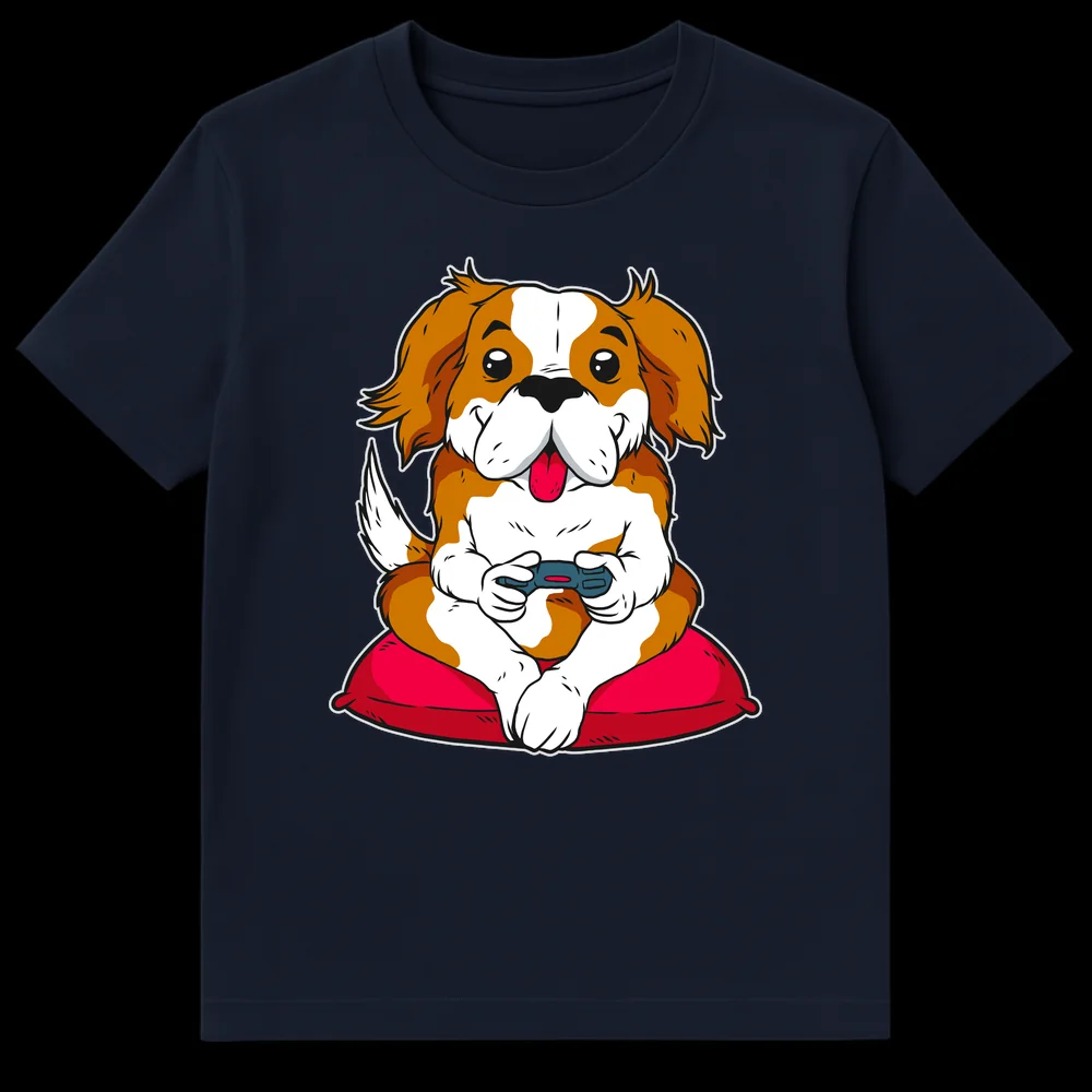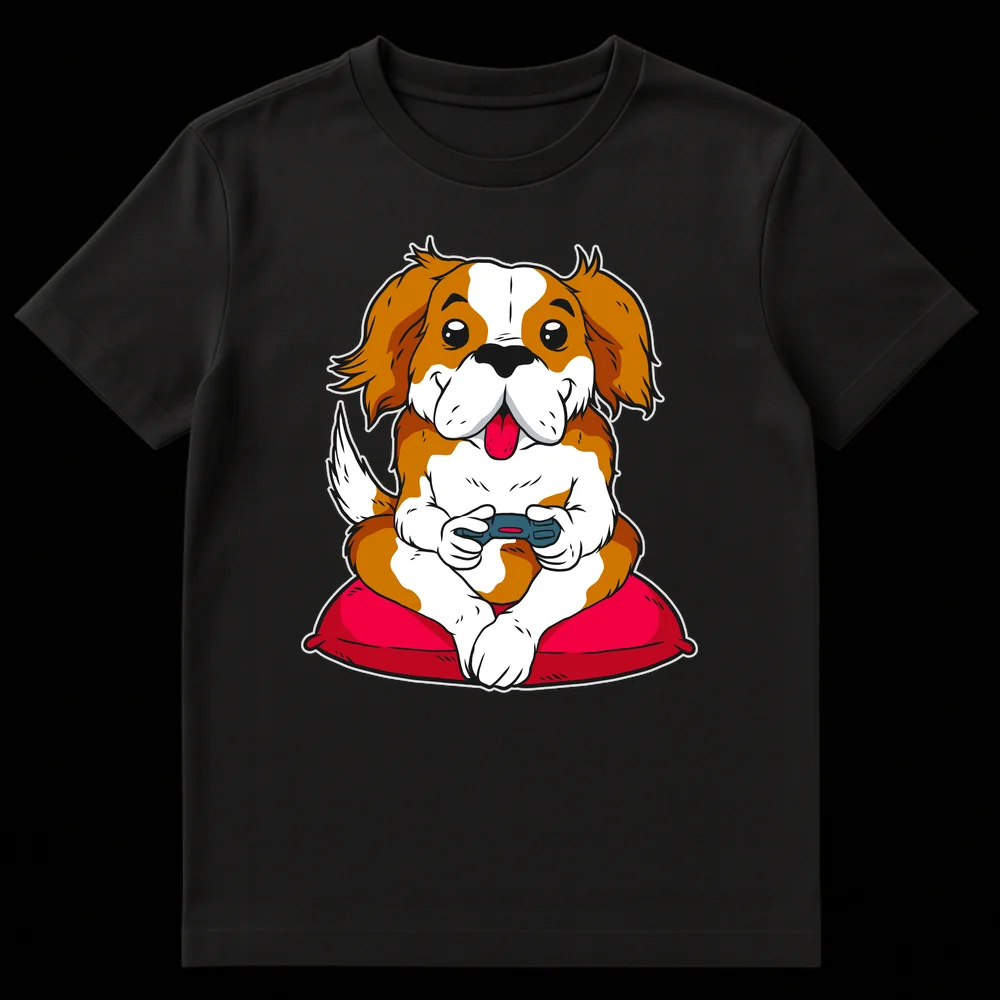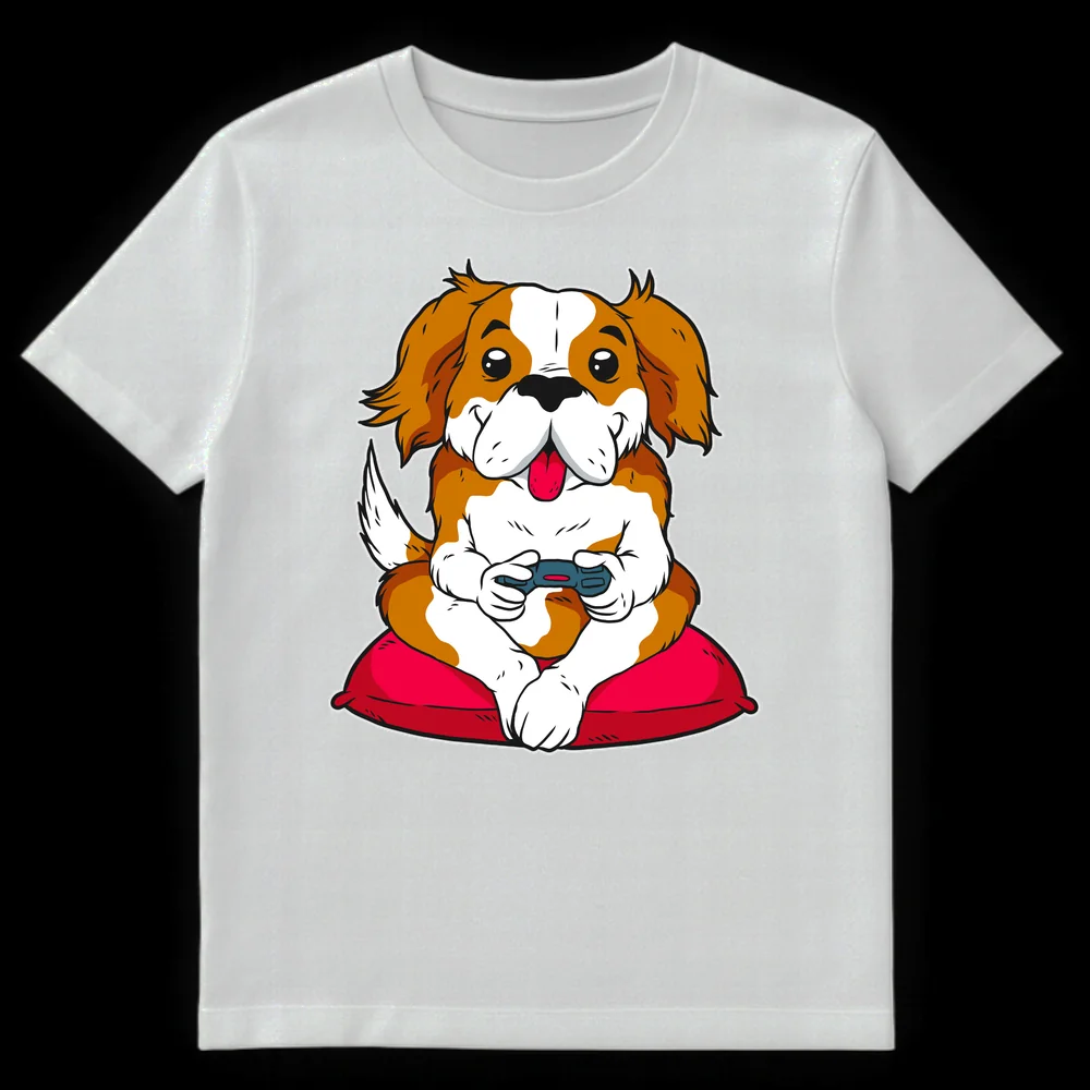 Dive into the delightful world of our Gamer Dog t-shirt, showcasing a super cute, fluffy dog, possibly a Cavalier King Charles Spaniel or Cocker Spaniel, happily engrossed in a video game with a controller. This unique design captures the heartwarming humor of a beloved pet indulging in a very human hobby, creating a perfect blend of dog lover and gaming enthusiasm. The vibrant, cartoonish illustration with its bold outlines and cozy red cushion is sure to stand out. It’s an ideal gift for dog parents, video game players, or anyone who loves adorable animals and a good laugh. Celebrate the joy of companionship and the fun of gaming with this endearing, conversation-starting tee, designed for comfort and smiles.
