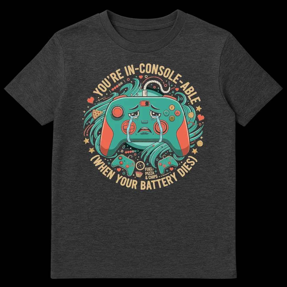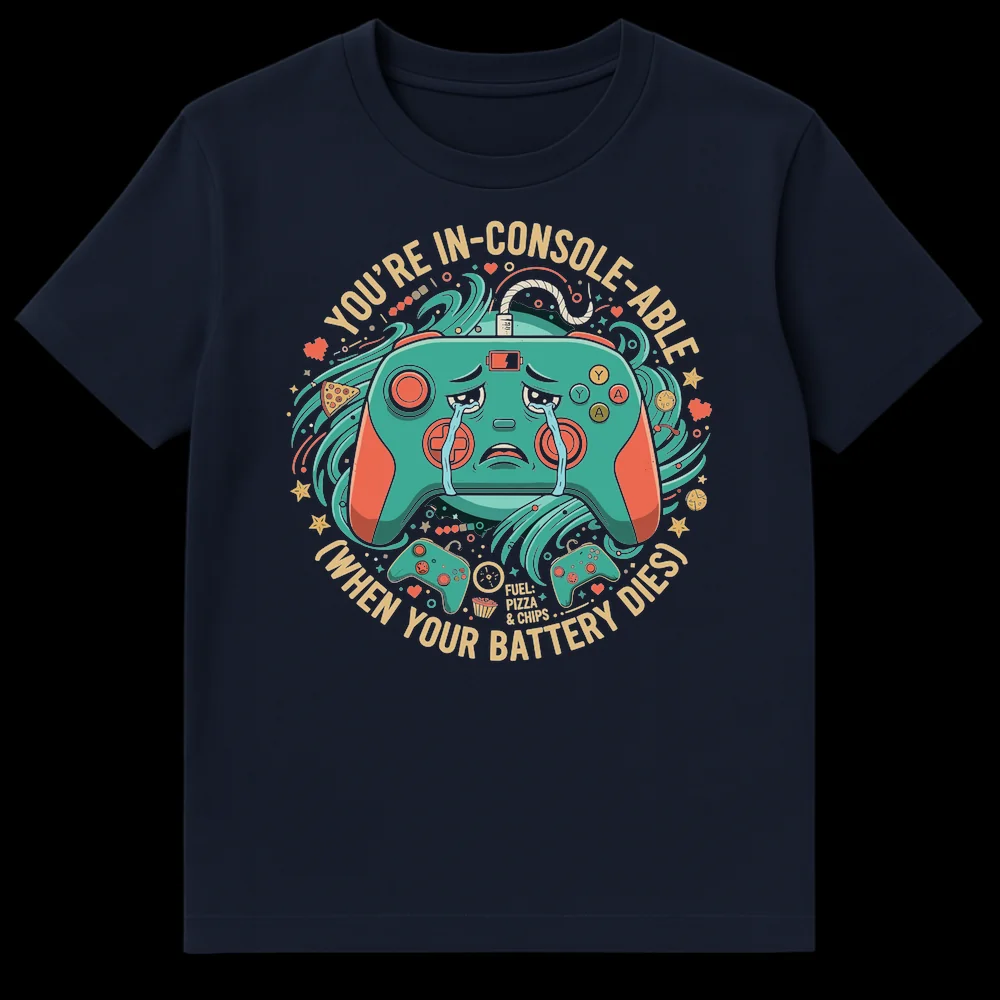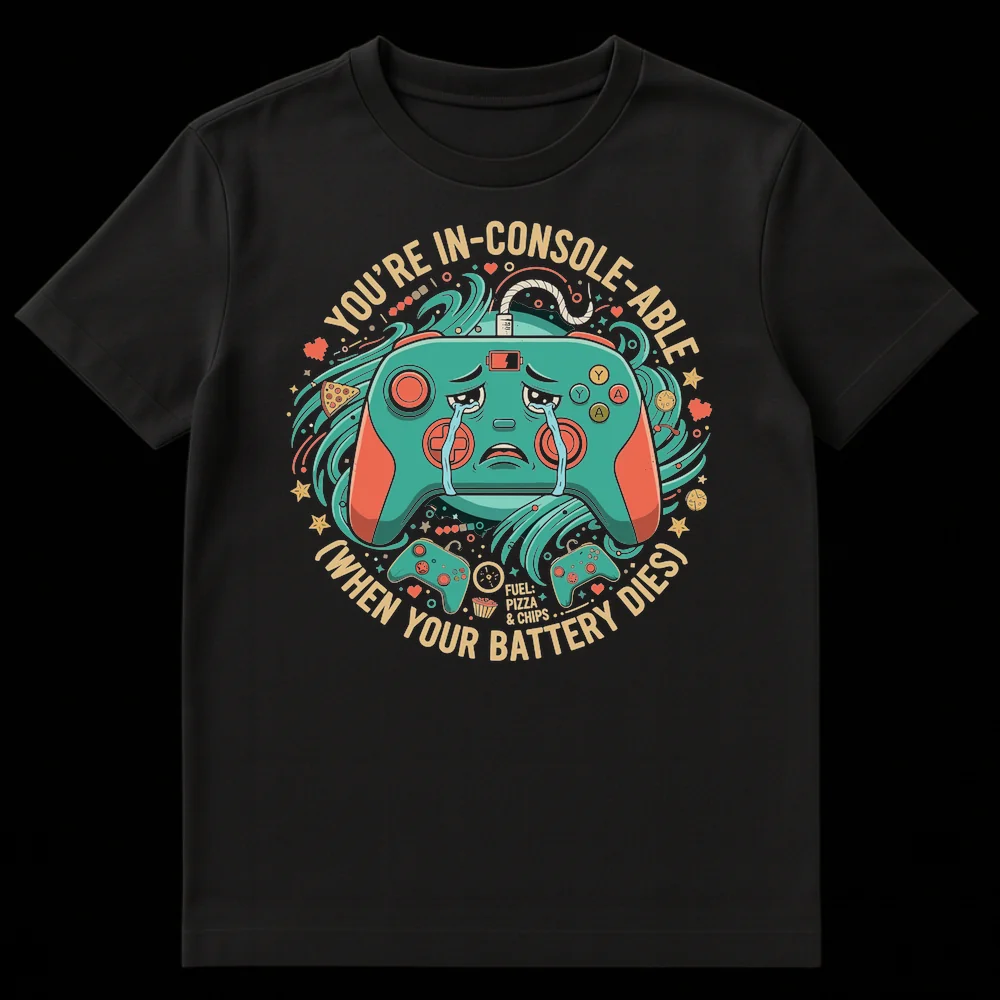 Unplug from the sadness and plug into style with our “YOU’RE IN-CONSOLE-ABLE” t-shirt! This tee brilliantly combines clever wordplay with a universally relatable gamer struggle: the dreaded dying controller battery. Featuring an anthropomorphic game controller shedding exaggerated tears, this design visually articulates the despair every gamer feels. Emblazoned with the iconic phrase “FUEL: PIZZA & CHIPS,” it celebrates the full gamer lifestyle—both the highs of gameplay and the lows of battery life. Crafted for comfort and designed to spark smiles, it’s the perfect humorous gift for console players, video game enthusiasts, or anyone who appreciates a witty pun. Wear your gamer pride and make a statement that’s both funny and totally “in-console-able”!