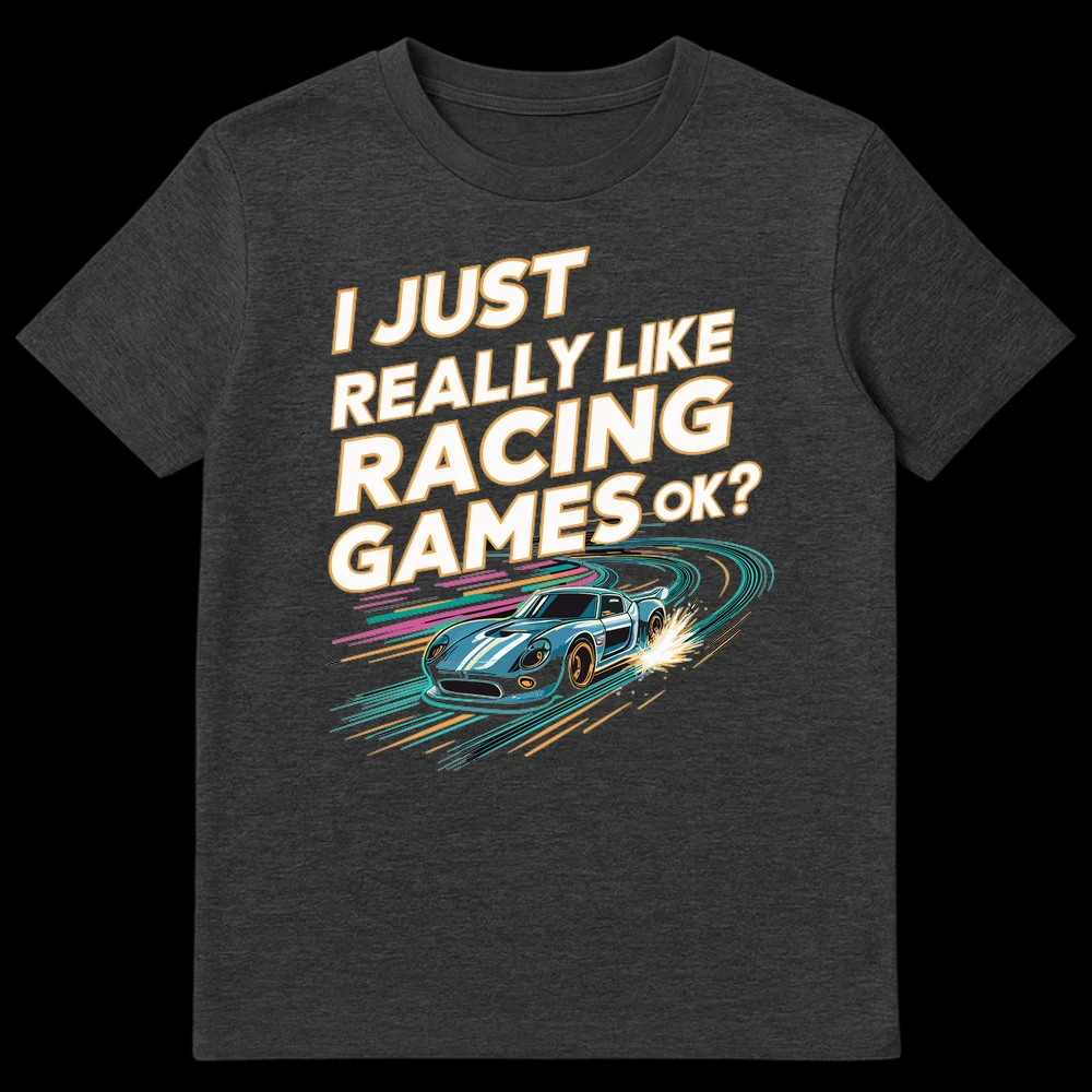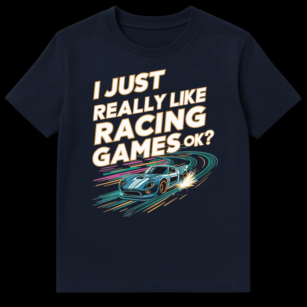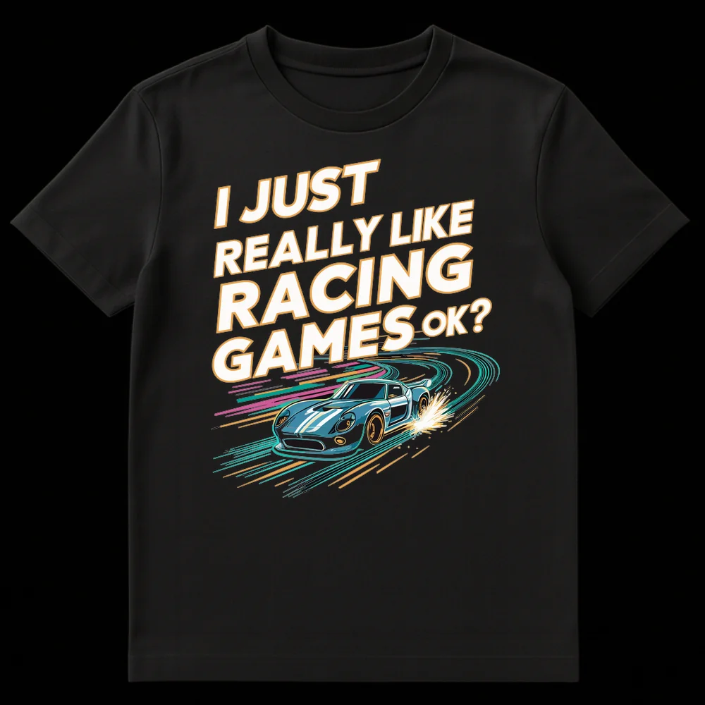 Declare your passion with our “I JUST REALLY LIKE RACING GAMES OK?” t-shirt. Featuring a dynamic, synthwave-inspired race car illustration and bold text, this tee captures the relatable humor of a dedicated gamer. It’s the perfect gift for racing game fans who proudly embrace their hobby, blending vibrant style with an iconic gaming sentiment.