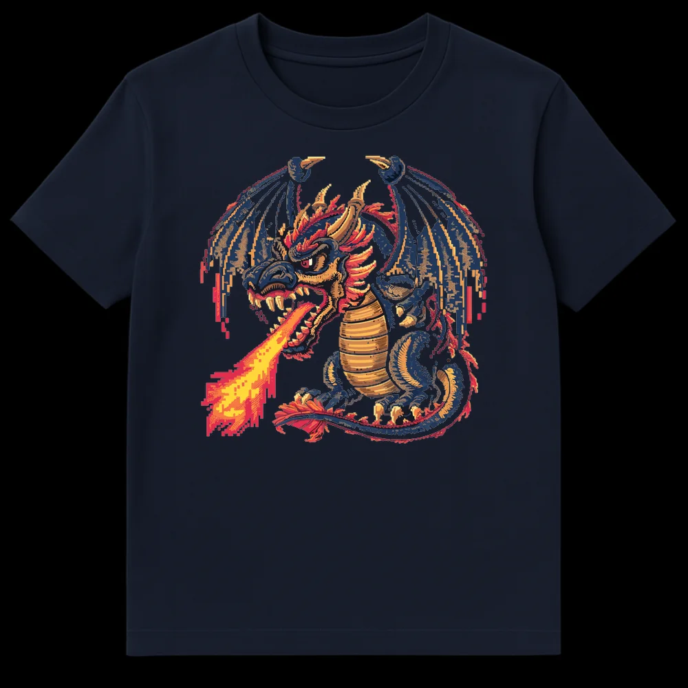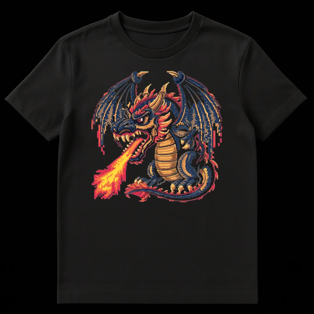 Unleash your inner gamer with this electrifying t-shirt featuring a fierce, fire-breathing pixel art dragon. Adorned with striking digital glitch effects, it captures the intensity of an epic boss battle. It’s the perfect gift for fantasy fans, retro gaming aficionados, and anyone who appreciates unique digital art.