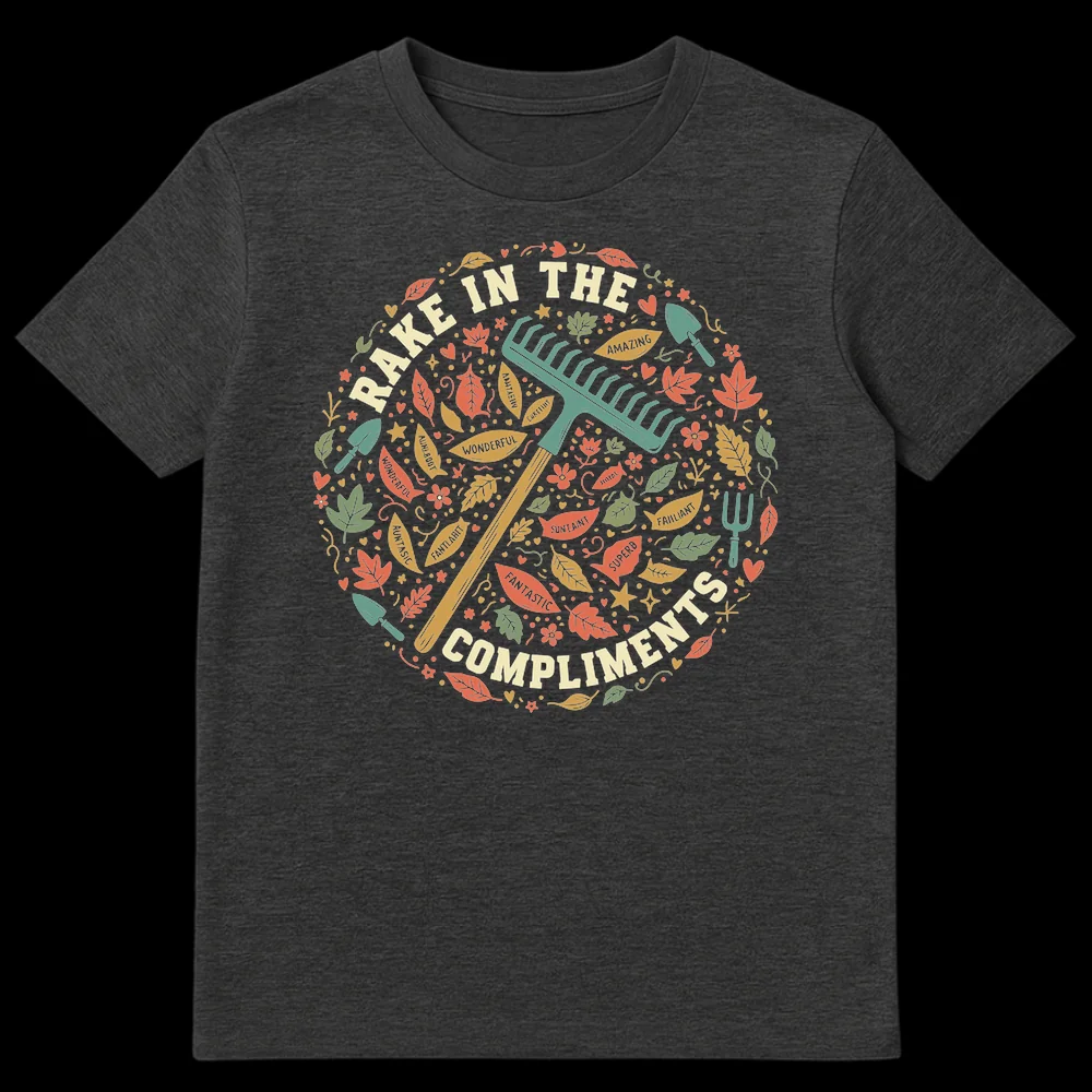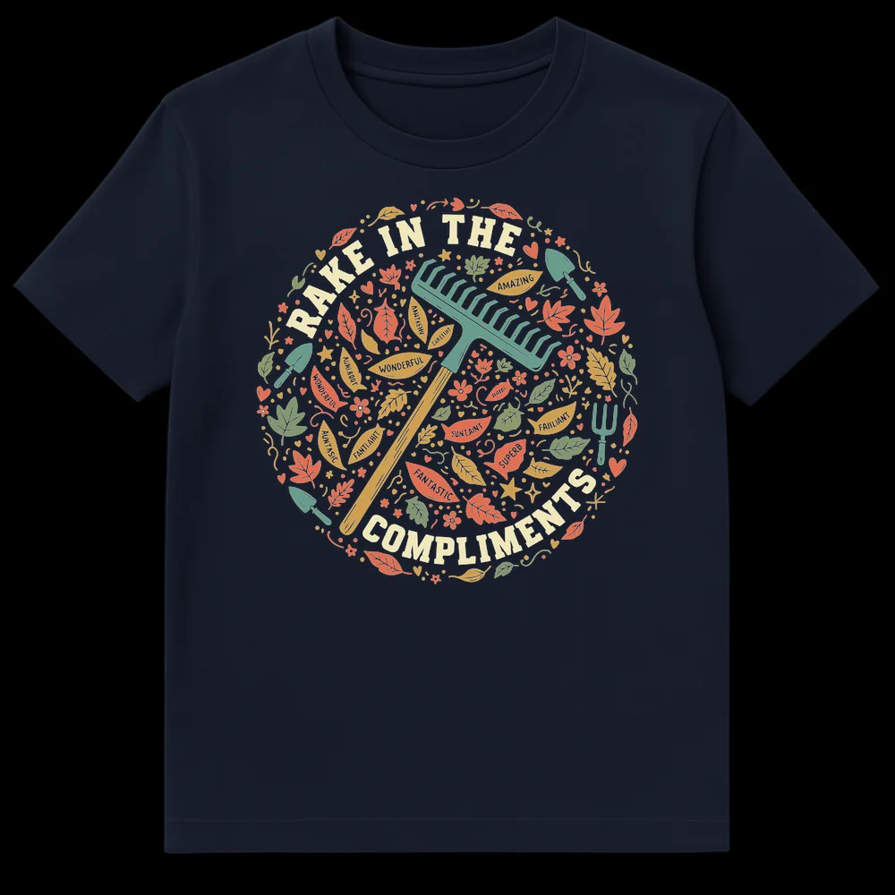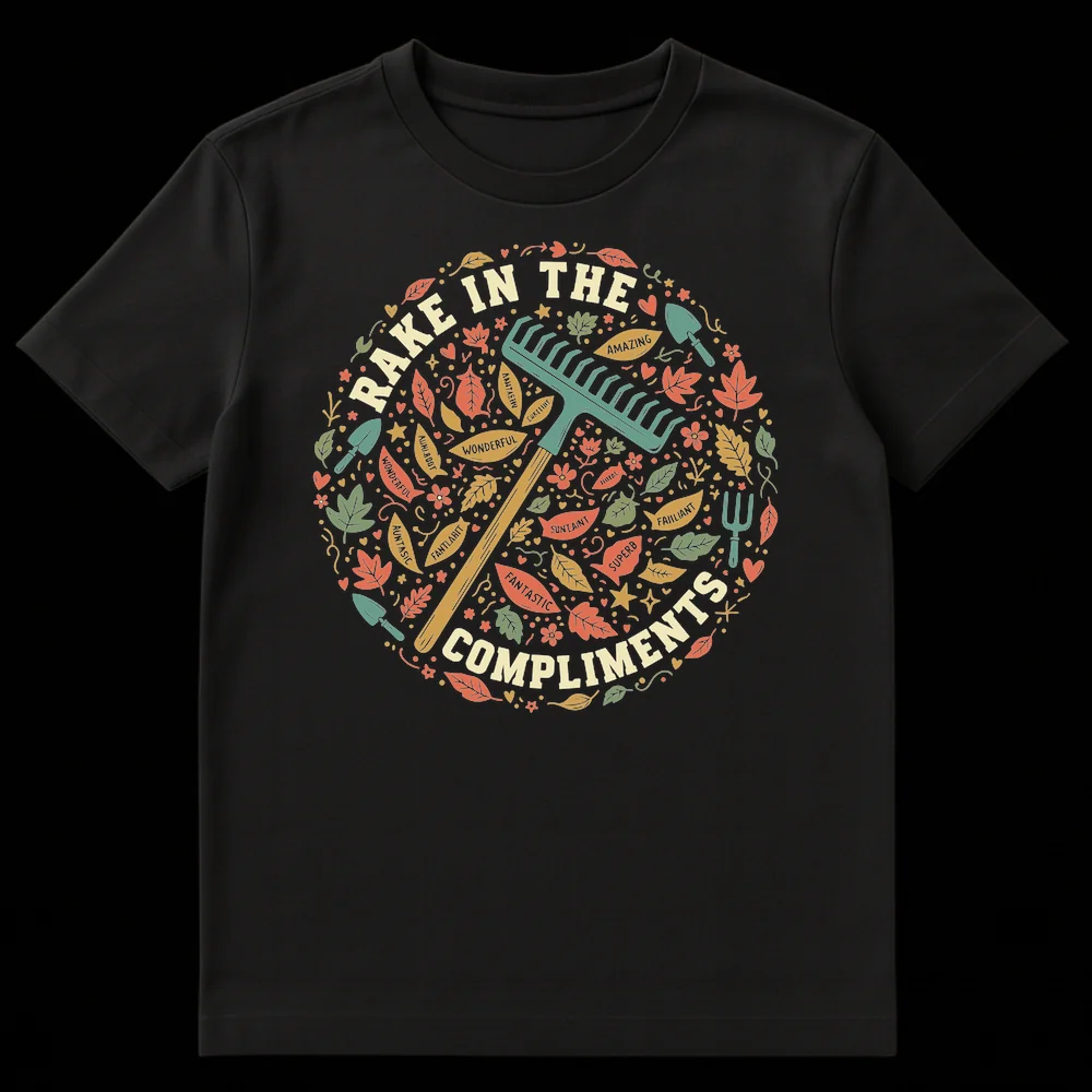 Our ‘Rake In The Compliments’ t-shirt is a clever visual pun for any gardening enthusiast. This whimsical design features a garden rake surrounded by autumn leaves inscribed with positive affirmations, making it a truly uplifting wear. It’s a fantastic gift for gardeners, pun lovers, or anyone who enjoys wholesome humor and a confidence boost.