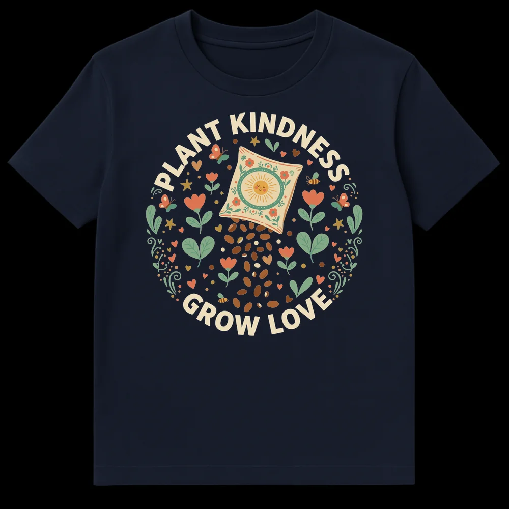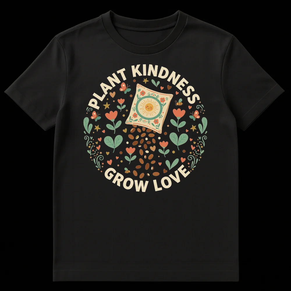 Cultivate a world of positivity with our unique ‘Plant Kindness Grow Love’ T-shirt. This design, rendered in a charming boho-chic folk art style with warm, earthy colors, is a visual and philosophical delight. It elegantly combines a stylized seed packet spilling seeds, surrounded by whimsical flowers, buzzing bees, and graceful butterflies, all conveying a powerful message. The text, ‘Plant Kindness Grow Love,’ is a beautiful metaphor, reminding us that just like tending a garden, nurturing kind actions leads to a bountiful harvest of love and connection. Ideal for gardeners, nature lovers, mindfulness practitioners, or anyone inspired by cottagecore aesthetics, this shirt isn’t just apparel; it’s a wearable affirmation. Share its uplifting message as a thoughtful gift or wear it as a statement of your personal philosophy for a kinder, more loving world.