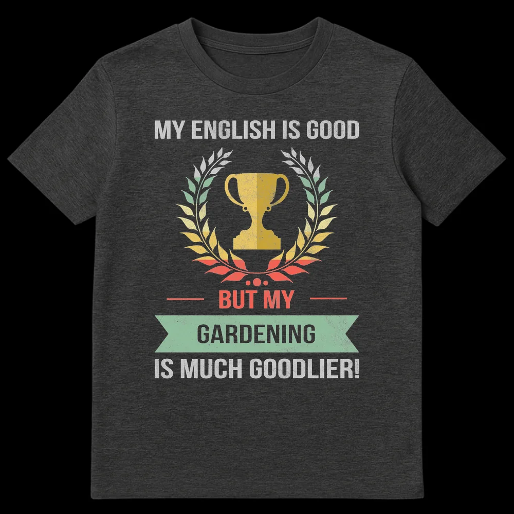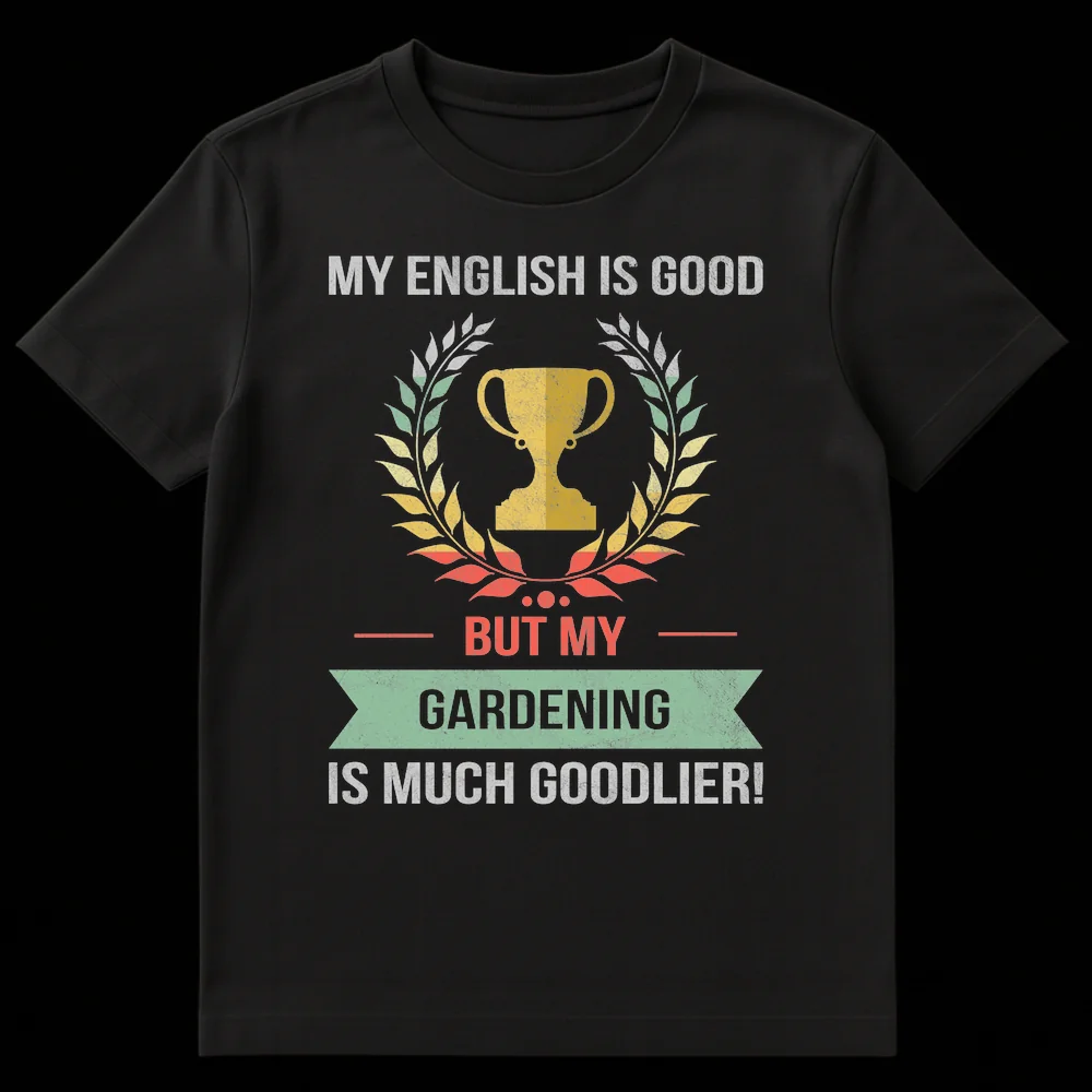 Unleash your inner plant-parent with our exclusive ‘My English Is Good But My Gardening Is Much Goodlier!’ t-shirt. This design masterfully combines a distressed retro aesthetic with witty wordplay, featuring a classic trophy and laurel wreath symbolizing gardening excellence. The intentionally incorrect ‘goodlier’ adds a charmingly self-deprecating yet ultimately boastful humor, perfect for those who prioritize their flourishing plants over impeccable grammar. It’s an ideal conversation starter and a unique way to express passion for horticulture. Crafted for comfort, this tee makes a fantastic, funny gardening gift for birthdays, Mother’s Day, Father’s Day, or any occasion to celebrate the dedicated gardener in your life. Show off your superior plant-growing prowess with a smile!