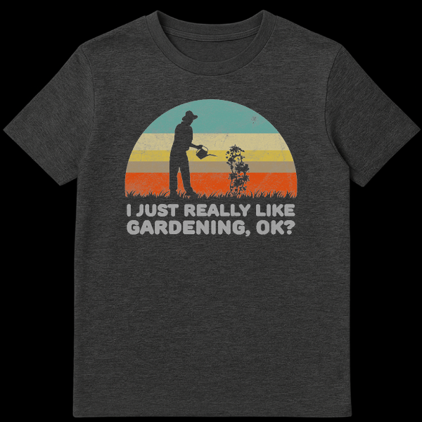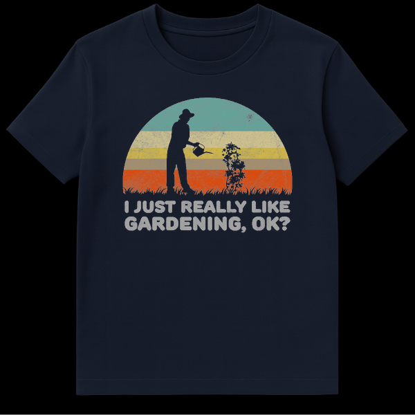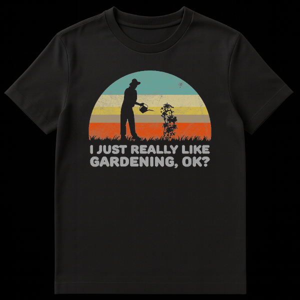 Embrace your inner plant whisperer with this charming vintage-inspired t-shirt, featuring a striking sunset silhouette of a person happily watering plants. The text “I JUST REALLY LIKE GARDENING, OK?” perfectly captures the quiet, undeniable passion of every gardening enthusiast. This unique design blends retro aesthetics with a humorous, relatable message, making it a perfect conversation starter. It’s an ideal gift for any gardener, plant lover, or anyone who finds peace and joy among their flora.
