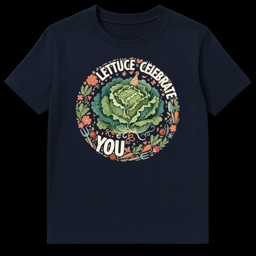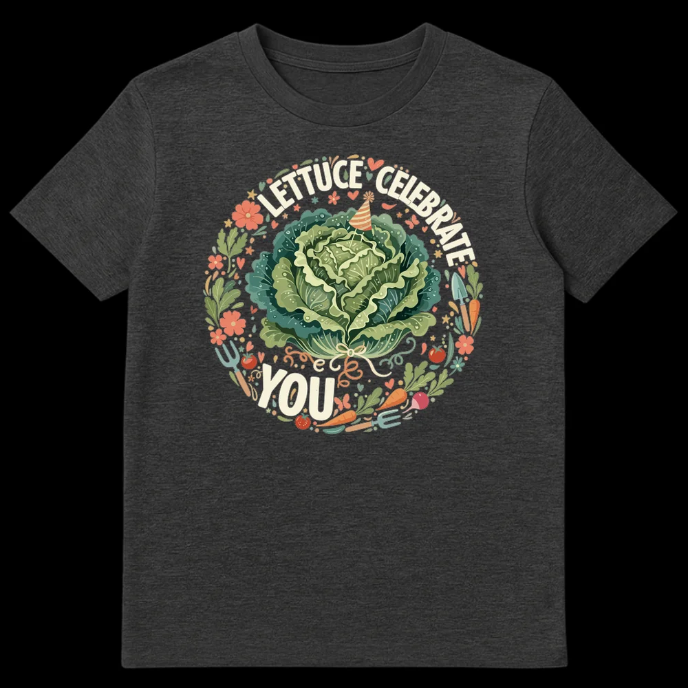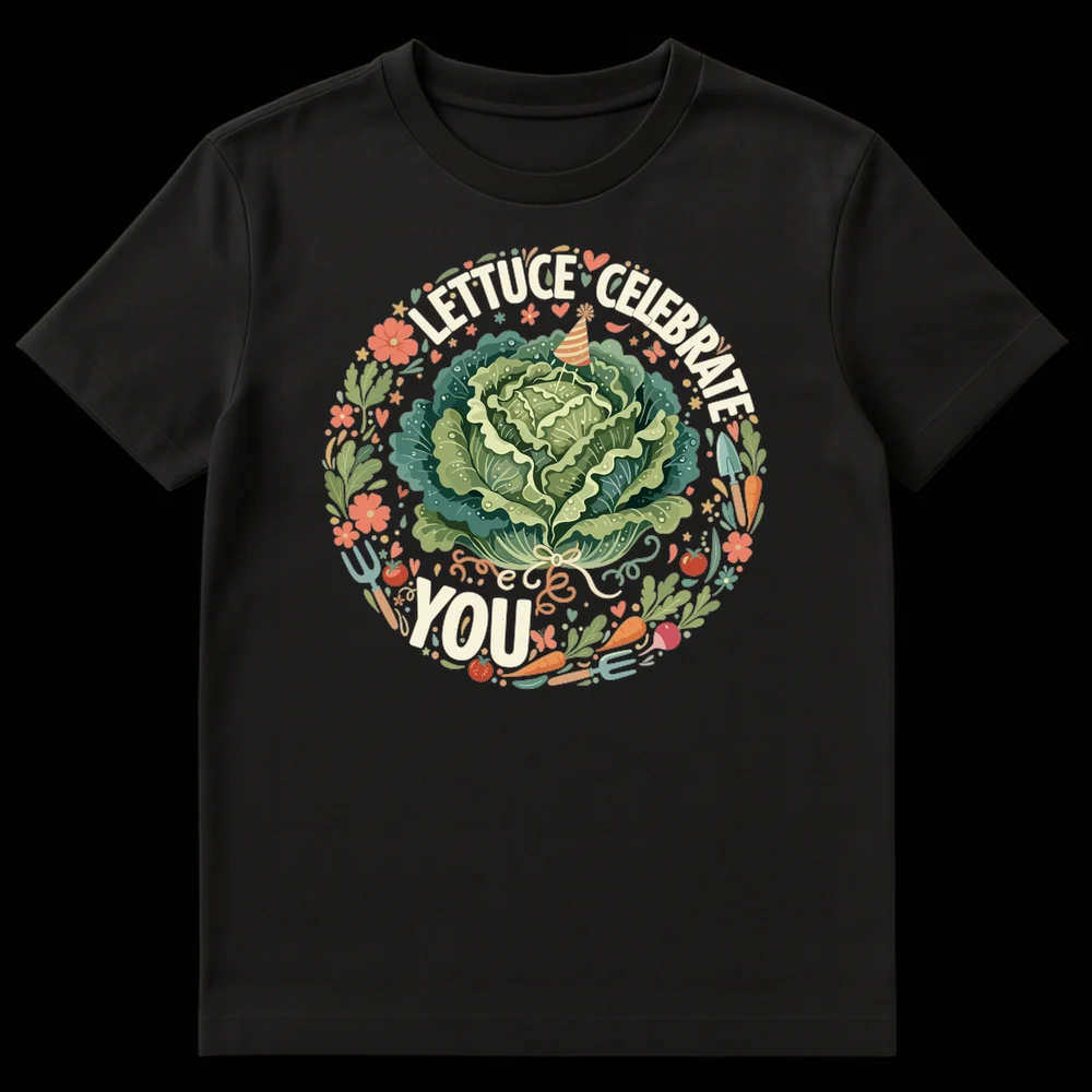 Celebrate with a smile! This unique t-shirt features a whimsical lettuce wearing a party hat, surrounded by garden delights, proclaiming “LETTUCE CELEBRATE YOU.” It’s the perfect gift for gardeners, plant lovers, or anyone who appreciates wholesome, clever food puns and cheerful designs. Show your appreciation with this adorable and funny tee.