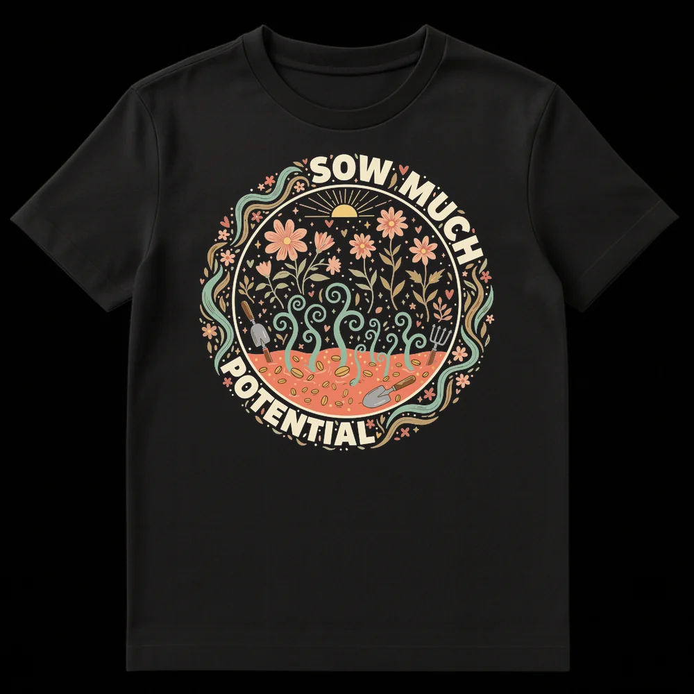 Celebrate growth with our “SOW MUCH POTENTIAL” t-shirt, blending a clever gardening pun with a hopeful message. This design features a charming hand-drawn garden scene within a circular frame, adorned with sprouts, flowers, and tools in a warm, earthy color palette. It’s the perfect gift for plant lovers, gardeners, and anyone embracing new beginnings.