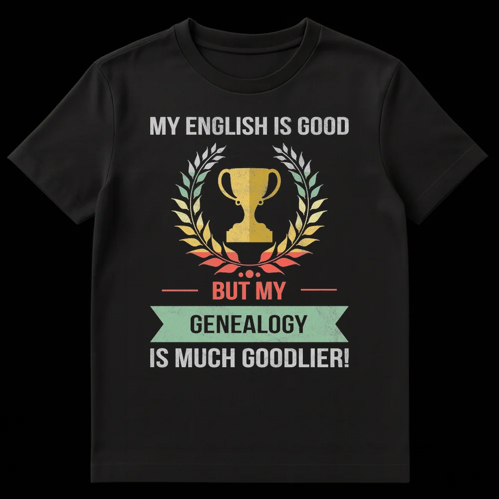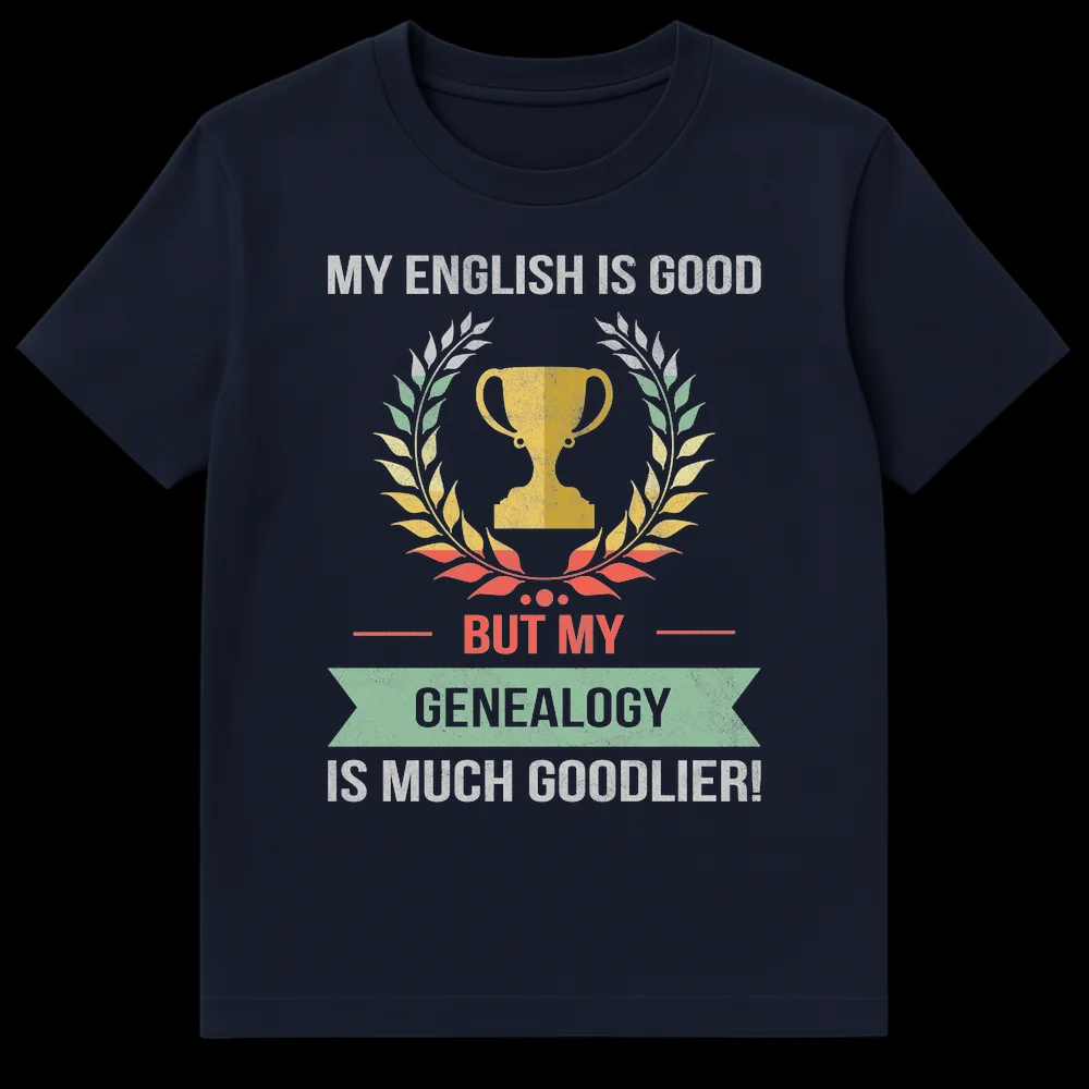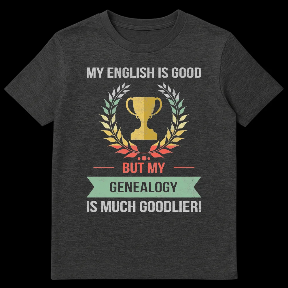 Celebrate your family roots with this witty ‘My English is Goodlier’ genealogy t-shirt! Featuring a vintage distressed trophy and laurel wreath, it humorously declares your passion for ancestry. Perfect for family historians or anyone who loves a clever linguistic pun, this shirt makes a fantastic gift for genealogy buffs.
