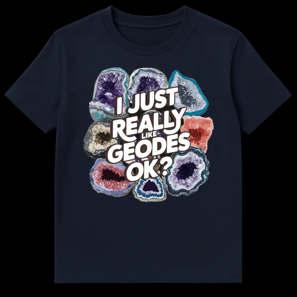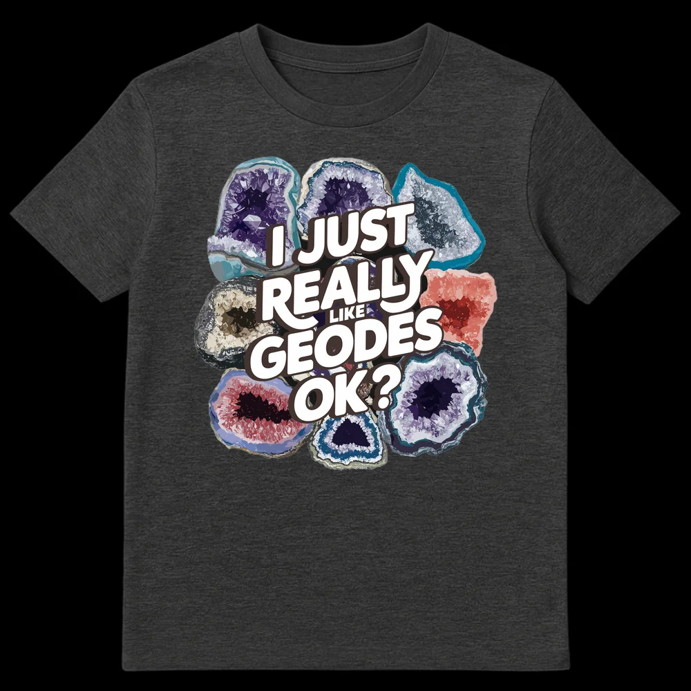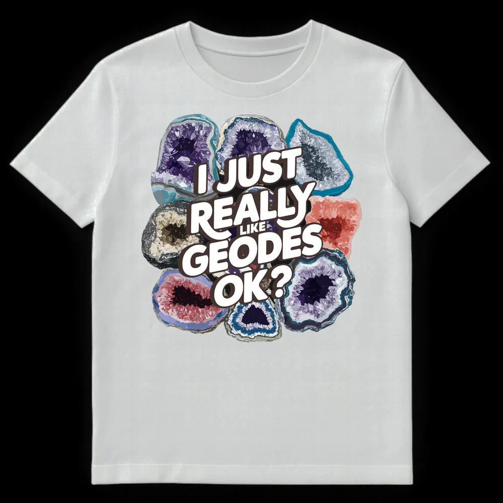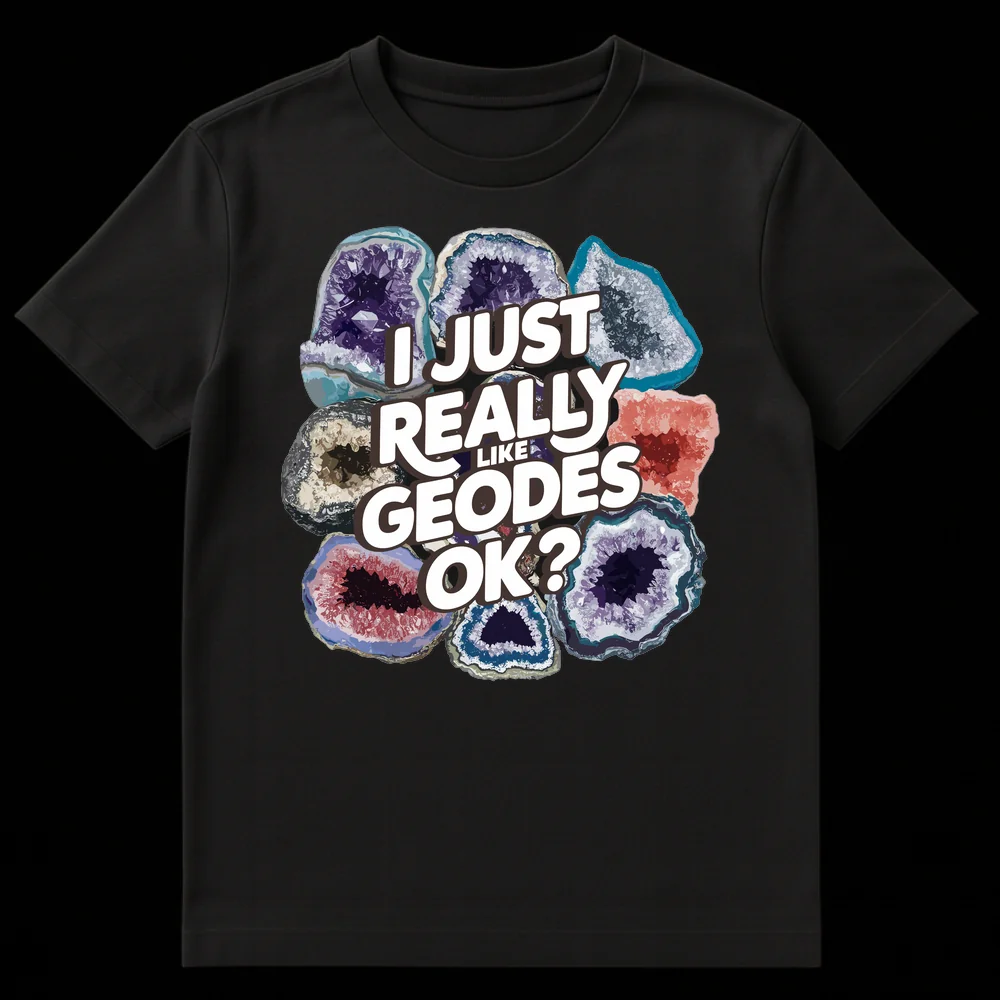 Declare your passion with this vibrant Geode Lover t-shirt featuring stylized, colorful geodes surrounding the playful text “I JUST REALLY LIKE GEODES OK?”. This shirt humorously expresses a genuine, slightly self-deprecating love for geology and crystals. It’s the perfect gift for any rock collector, mineral enthusiast, or crystal aesthetic admirer who proudly owns their unique hobby.