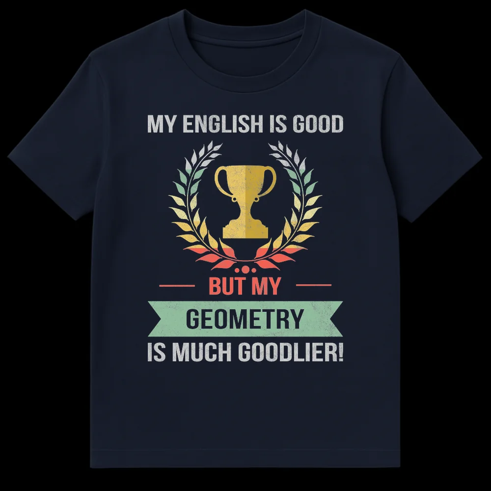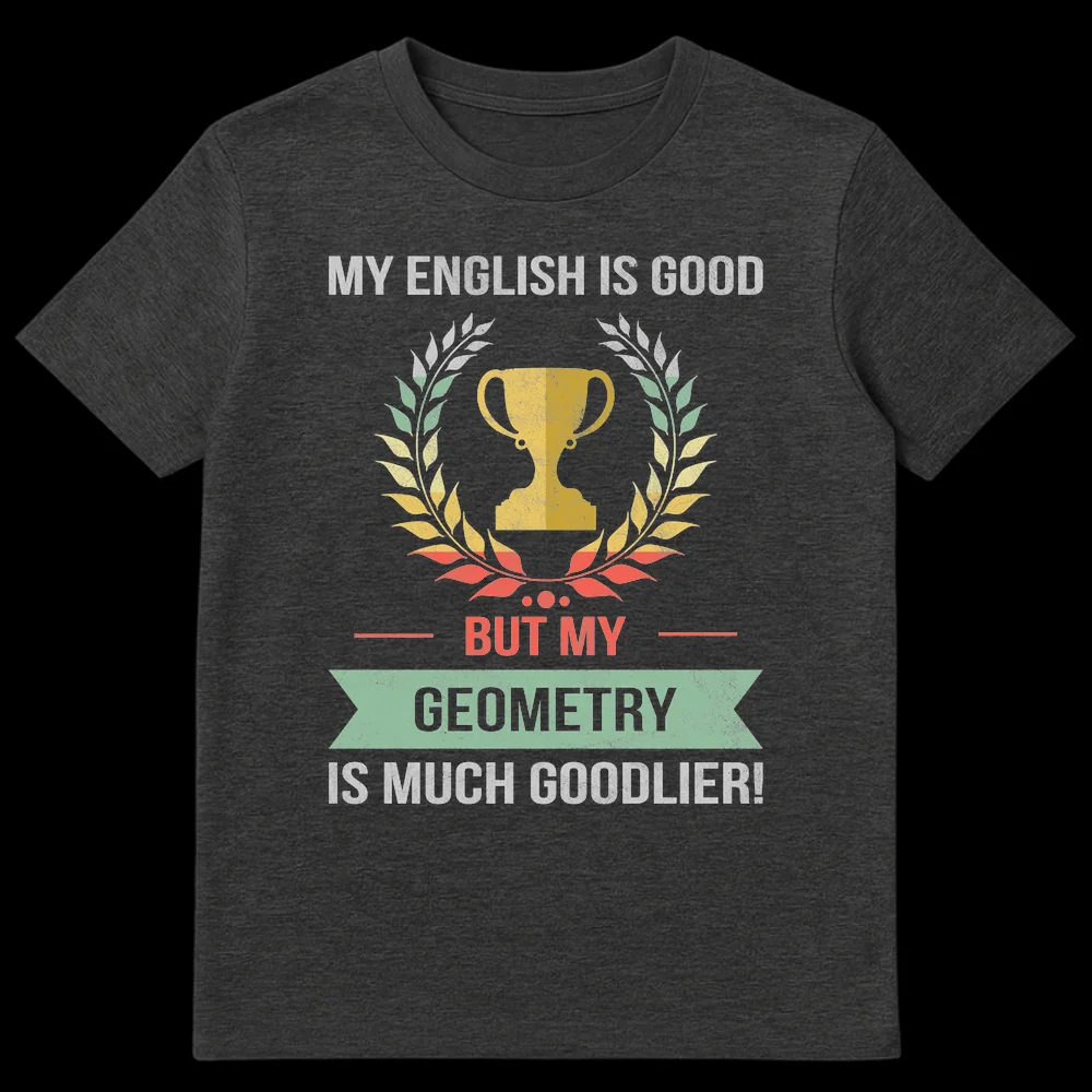 Show off your smarts with this humorous t-shirt featuring the clever phrase “MY ENGLISH IS GOOD BUT MY GEOMETRY IS MUCH GOODLIER!”. This design playfully twists grammar to celebrate a passion for geometry, making it a unique statement piece. Perfect for math teachers, students, or anyone who appreciates intellectual wordplay and a good chuckle. It’s an excellent gift that sparks conversation and highlights a love for STEM.