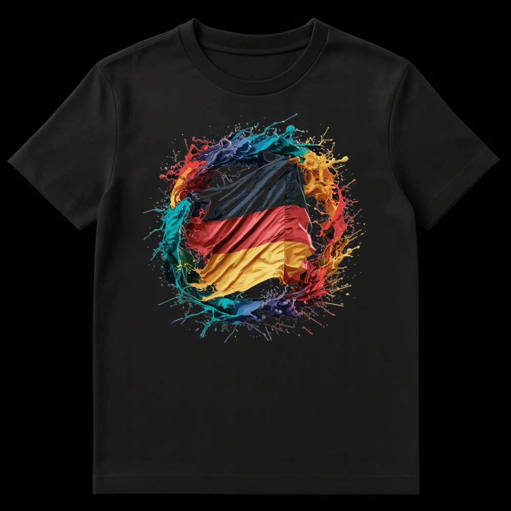 Showcase your unwavering German pride with this unique and eye-catching t-shirt. The design brilliantly captures the essence of national identity, featuring the German flag in a state of dynamic motion, as if waving passionately. Surrounding this powerful symbol is an exhilarating burst of vibrant, multi-colored paint splashes, creating a modern ‘liquid art’ effect that radiates energy and enthusiasm. This isn’t just a shirt; it’s an artistic statement of passion and support for Germany, whether you’re cheering on your favorite sports team, celebrating national holidays, or simply expressing your heritage. Perfect for German patriots, football (soccer) enthusiasts, travel lovers who admire German culture, or anyone who appreciates contemporary graphic design. It makes an exceptional gift for birthdays, national events, or as a thoughtful gesture to friends and family with a strong connection to Germany.