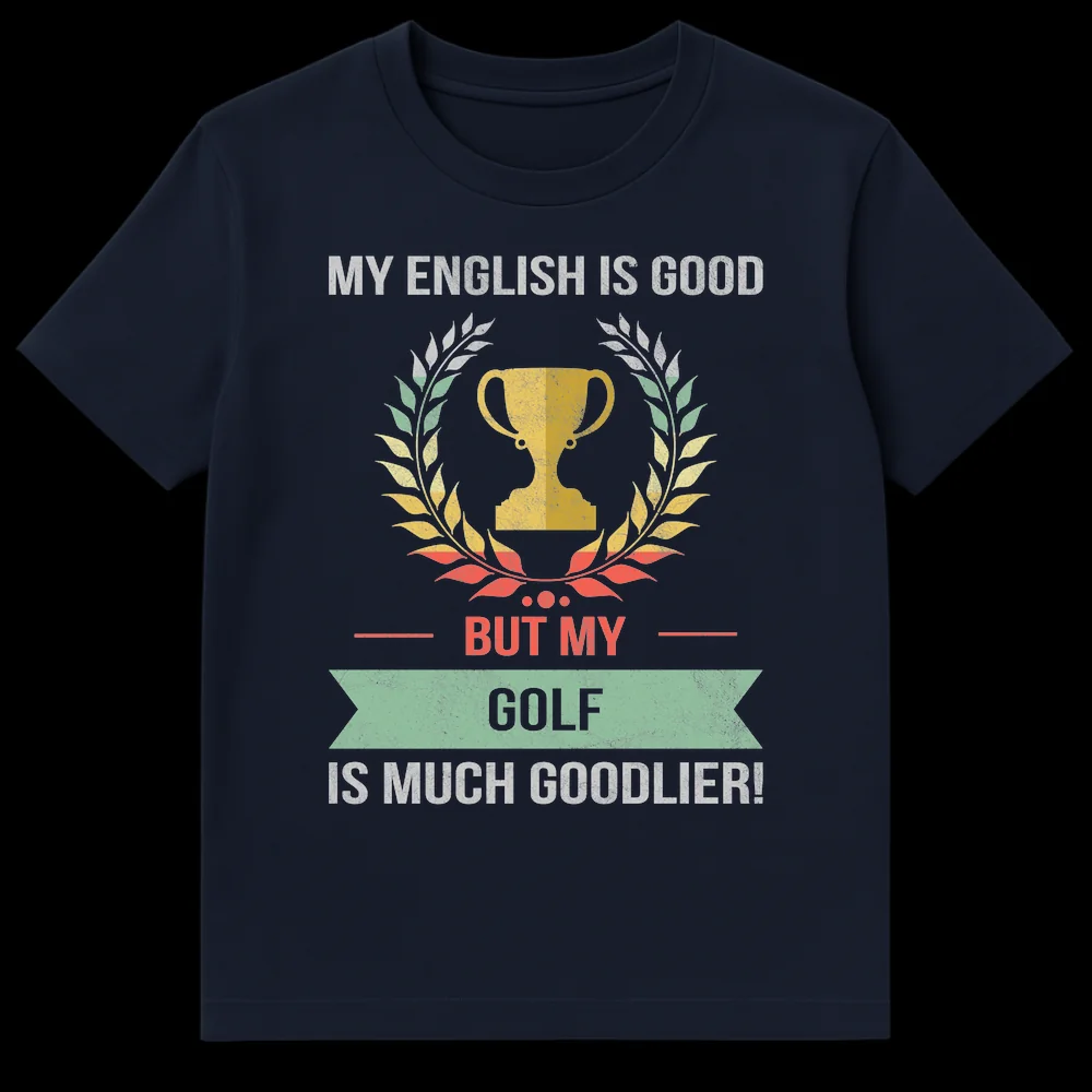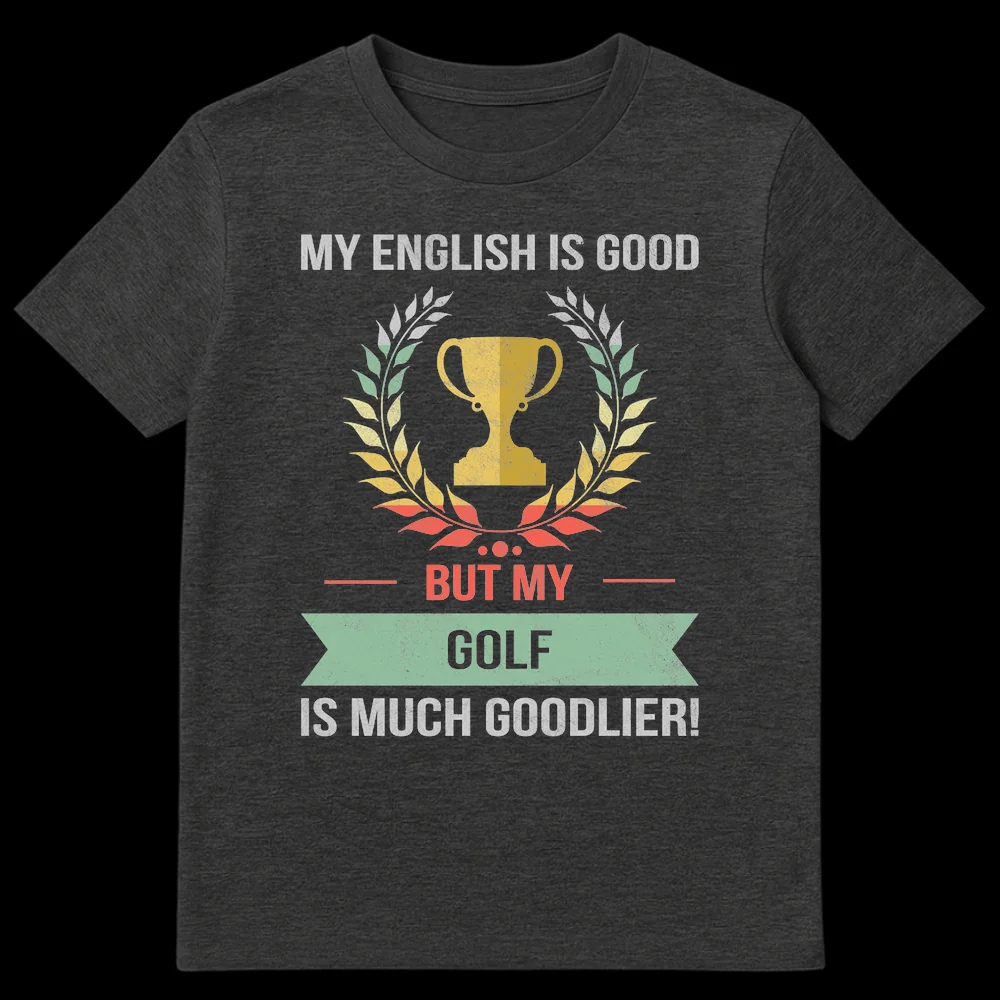 Step onto the green with confidence and a chuckle in our ‘Goodlier Golf’ t-shirt! This unique design proudly proclaims, “MY ENGLISH IS GOOD — BUT MY — GOLF IS MUCH GOODLIER!”, a brilliant linguistic twist that celebrates your superior skills on the course. The vintage-inspired typography and classic trophy emblem give it a timeless appeal, while the distressed texture adds character. It’s more than just a shirt; it’s a playful statement of golf mastery, perfect for those who appreciate witty banter and hyperbolic boasts. Ideal for casual wear, golf outings, or as a hilarious gift for the dad, grandpa, friend, or partner who lives and breathes golf, and isn’t afraid to bend a few grammar rules for a laugh.