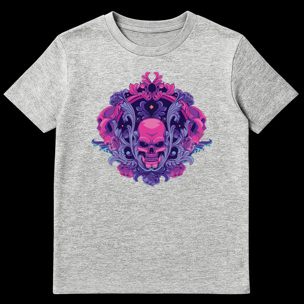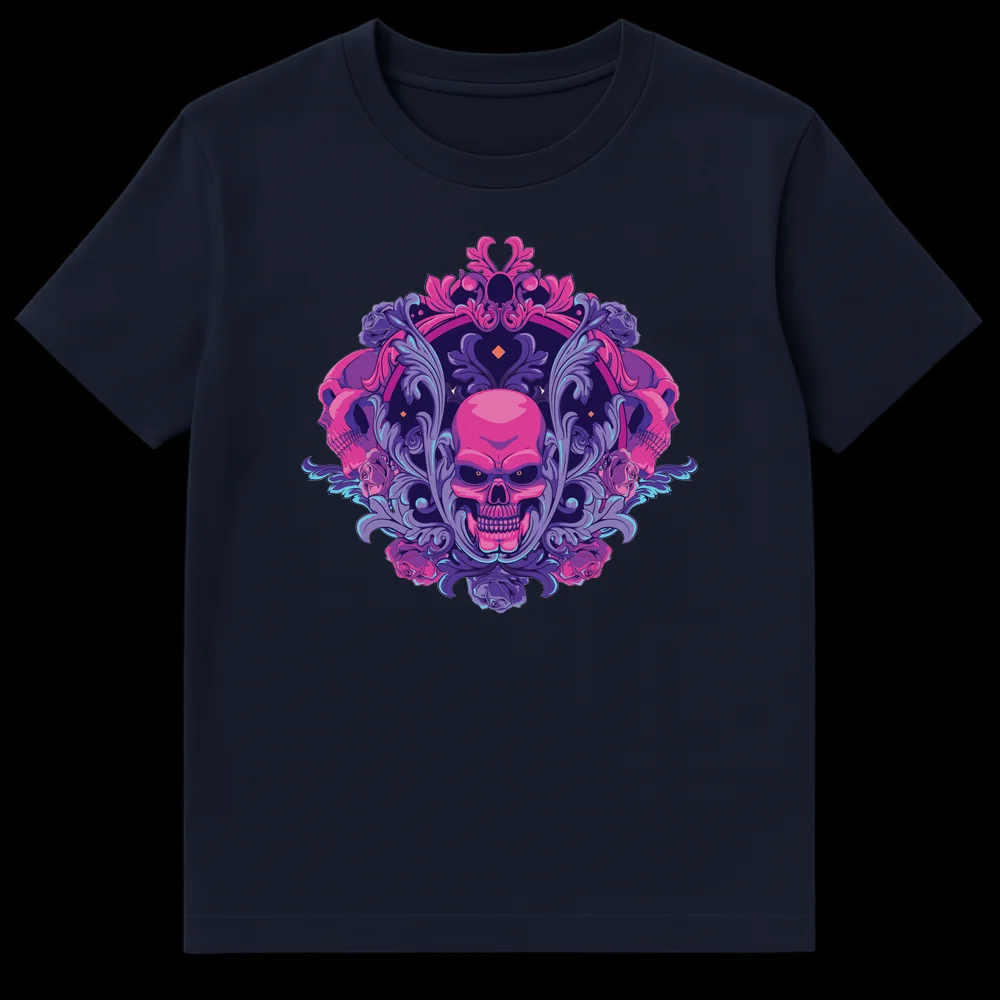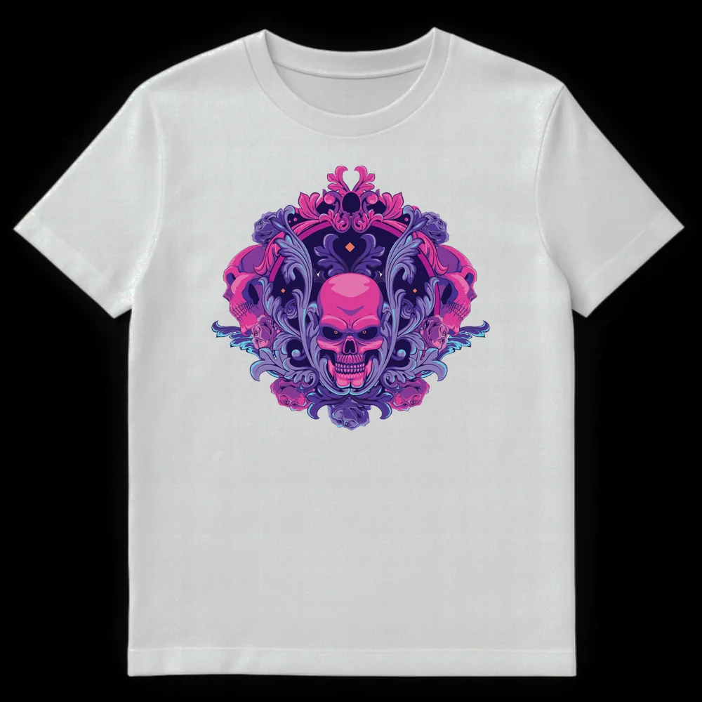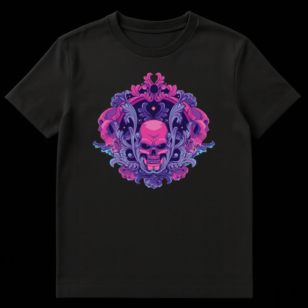 Embrace edgy elegance with this striking Neon Skull Rose t-shirt, blending macabre beauty with vibrant vaporwave aesthetics. Featuring a central glowing-eyed skull flanked by ornate roses and skulls, it’s a bold statement piece. Perfect for gothic enthusiasts, alternative fashion lovers, and anyone who appreciates dark romanticism and unique art.