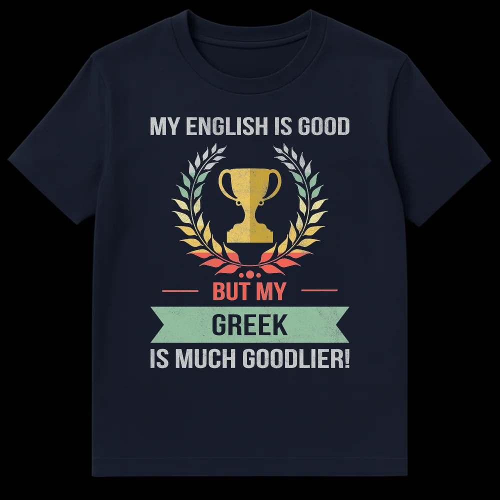 Showcase your Hellenic pride and a playful sense of humor with our “My English Is Good But My Greek Is Much Goodlier!” t-shirt. This unique design features a clever, grammatically humorous slogan that highlights your love for the Greek language and heritage. Adorned with a classic laurel wreath and trophy, symbols of ancient Greek achievement, the design embraces a vintage, distressed style, giving it an authentic, worn-in feel. It’s more than just a shirt; it’s a statement of cultural connection, a conversation starter, and a nod to your roots. Perfect for Greek Americans, philhellenes, language students, or anyone who appreciates a witty linguistic joke and their cultural identity. Gift this to a proud Greek speaker and watch them light up!