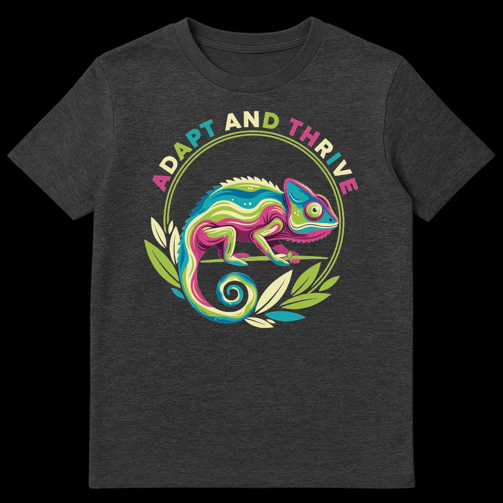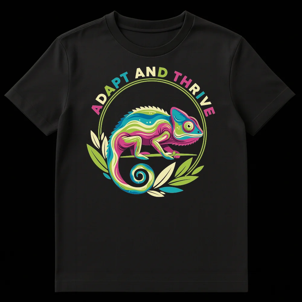Embrace change and flourish with our “ADAPT AND THRIVE” t-shirt, featuring a vibrant, stylized chameleon. This unique design beautifully symbolizes resilience and personal growth, making a bold statement about overcoming challenges. It’s the perfect inspirational gift for anyone navigating new beginnings, self-improvement enthusiasts, or those who value a positive, adaptable mindset.