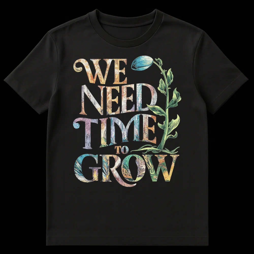 Embrace the journey with our ‘WE NEED TIME TO GROW’ t-shirt. This design beautifully blends elegant, botanical-textured typography with a detailed growing plant illustration, all against a striking black background. It’s a gentle reminder that all good things require patience and time, making it a perfect gift for anyone on a path of personal development or who appreciates nature’s wisdom.