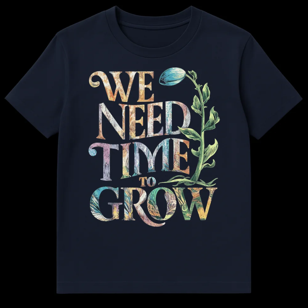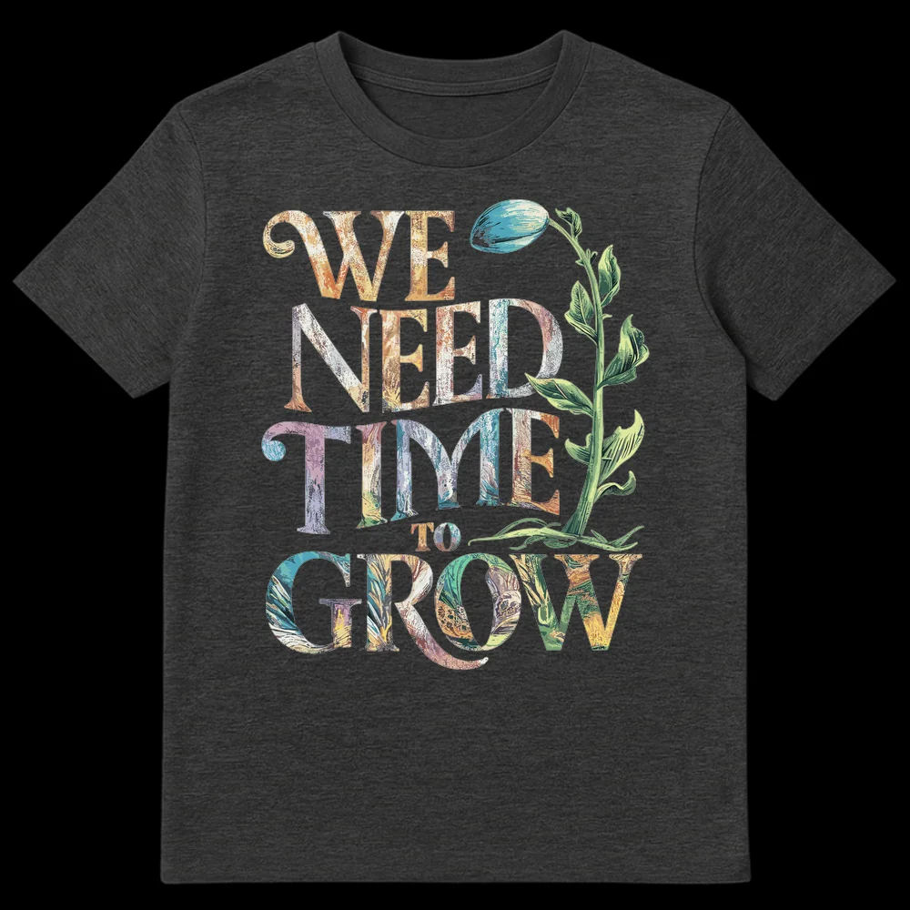 Celebrate the essential process of development with our unique ‘WE NEED TIME TO GROW’ t-shirt. This inspiring design features each word rendered in rich, variegated natural tones, mimicking the textures of tree bark and moss, while a finely detailed plant illustration roots the message in nature. The powerful, yet gentle, affirmation is a constant reminder to embrace patience and trust the organic flow of growth, whether in personal endeavors, relationships, or life’s challenges. It’s more than just apparel; it’s a wearable mantra for mindfulness, self-care, and understanding. This thoughtful tee makes an exceptional gift for gardeners, educators, mentors, nature enthusiasts, or anyone who values personal evolution and positive affirmations.