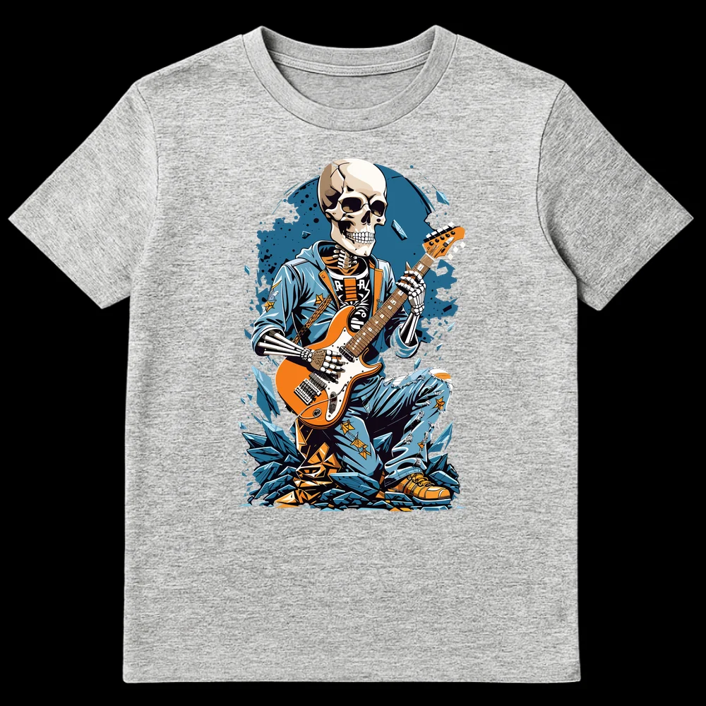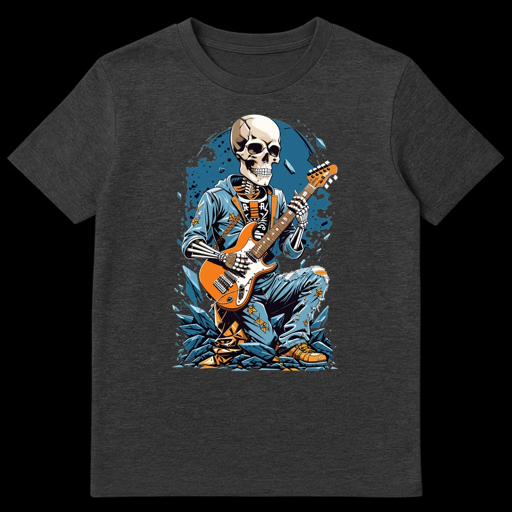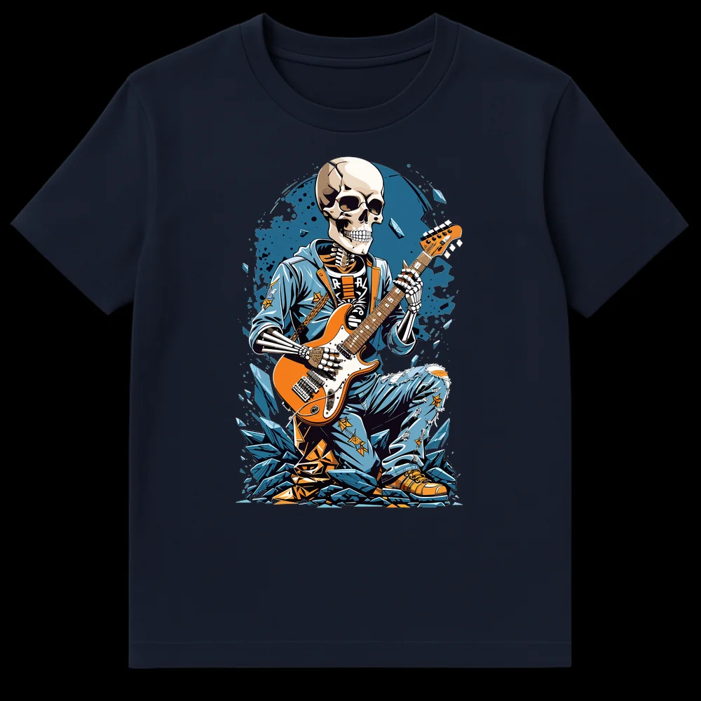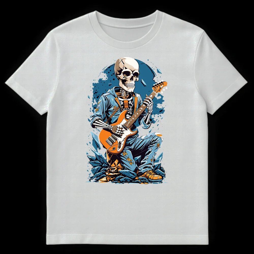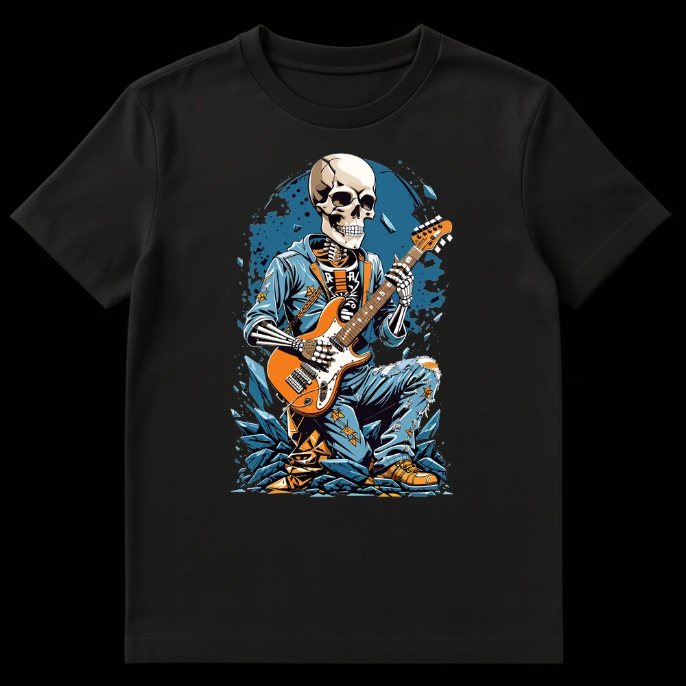 Celebrate the undying spirit of rock with our ‘Undead Rocker’ t-shirt! This striking design showcases an anthropomorphic skeleton, clad in a cool blue hoodie and distressed jeans, fiercely playing an orange electric guitar. The ‘R-A-R’ text on the skeleton’s shirt adds an enigmatic, edgy vibe, perfectly complementing the neo-traditional tattoo art style. Surrounded by an explosive backdrop of blue and orange shards, this tee embodies the raw energy and eternal rebellion of rock music. It’s an ideal choice for guitarists, rock fans, alternative fashion lovers, and anyone who wants to make a bold statement about their devotion to loud guitars and timeless tunes. Gift it to a friend who lives and breathes music, or wear it yourself to show off your unyielding rock ‘n’ roll soul.