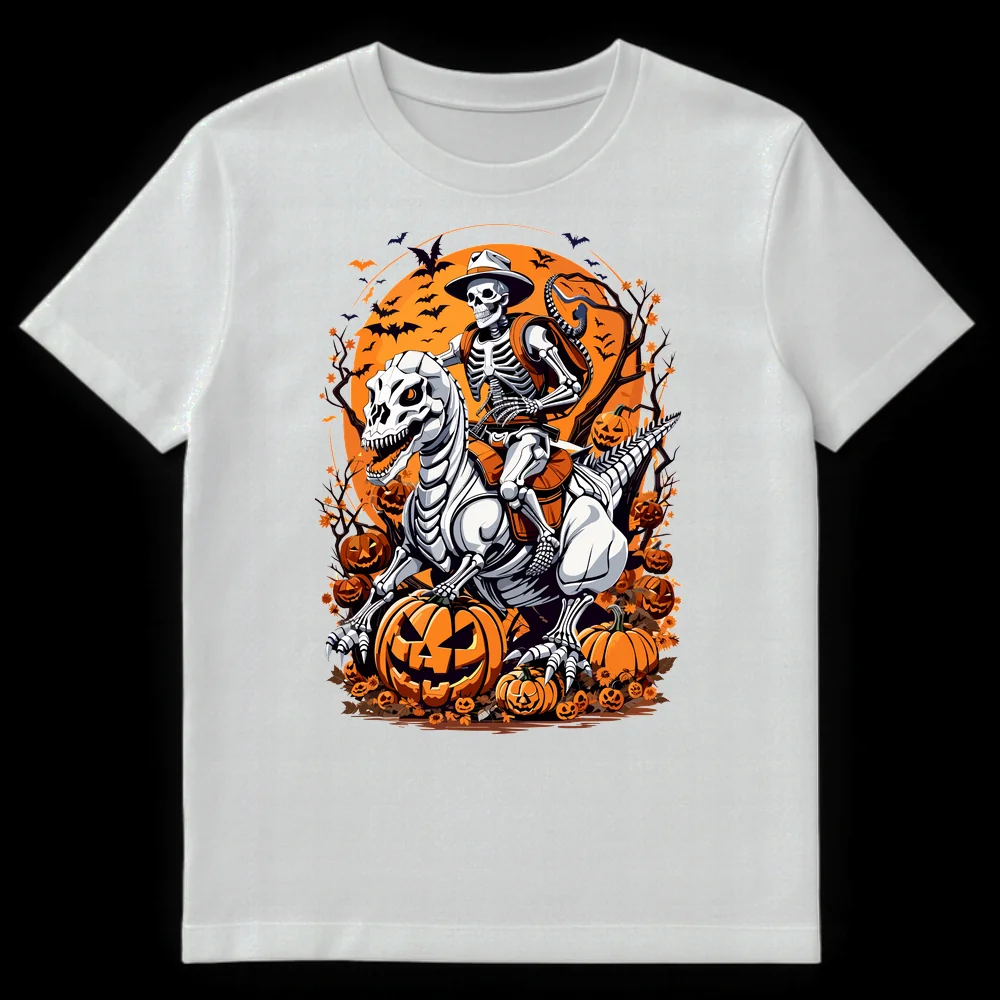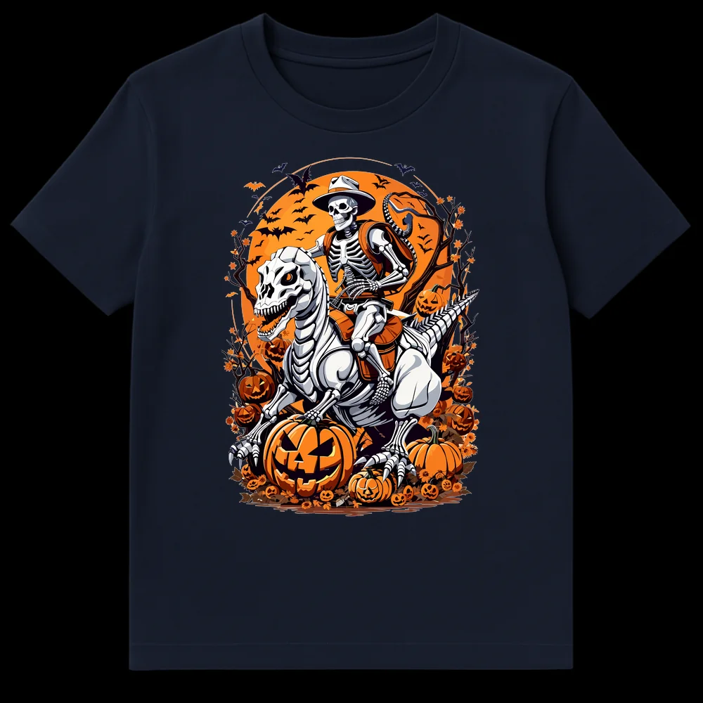 Unleash your inner adventurer with this epic design featuring a cowboy skeleton fearlessly riding a skeletal T-Rex under a vibrant orange Halloween moon. Surrounded by glowing jack-o’-lanterns and flying bats, this tee captures a unique blend of spooky fun and prehistoric fantasy. It’s the perfect gift for Halloween enthusiasts, dinosaur lovers, or anyone who enjoys cool, alternative graphic art.