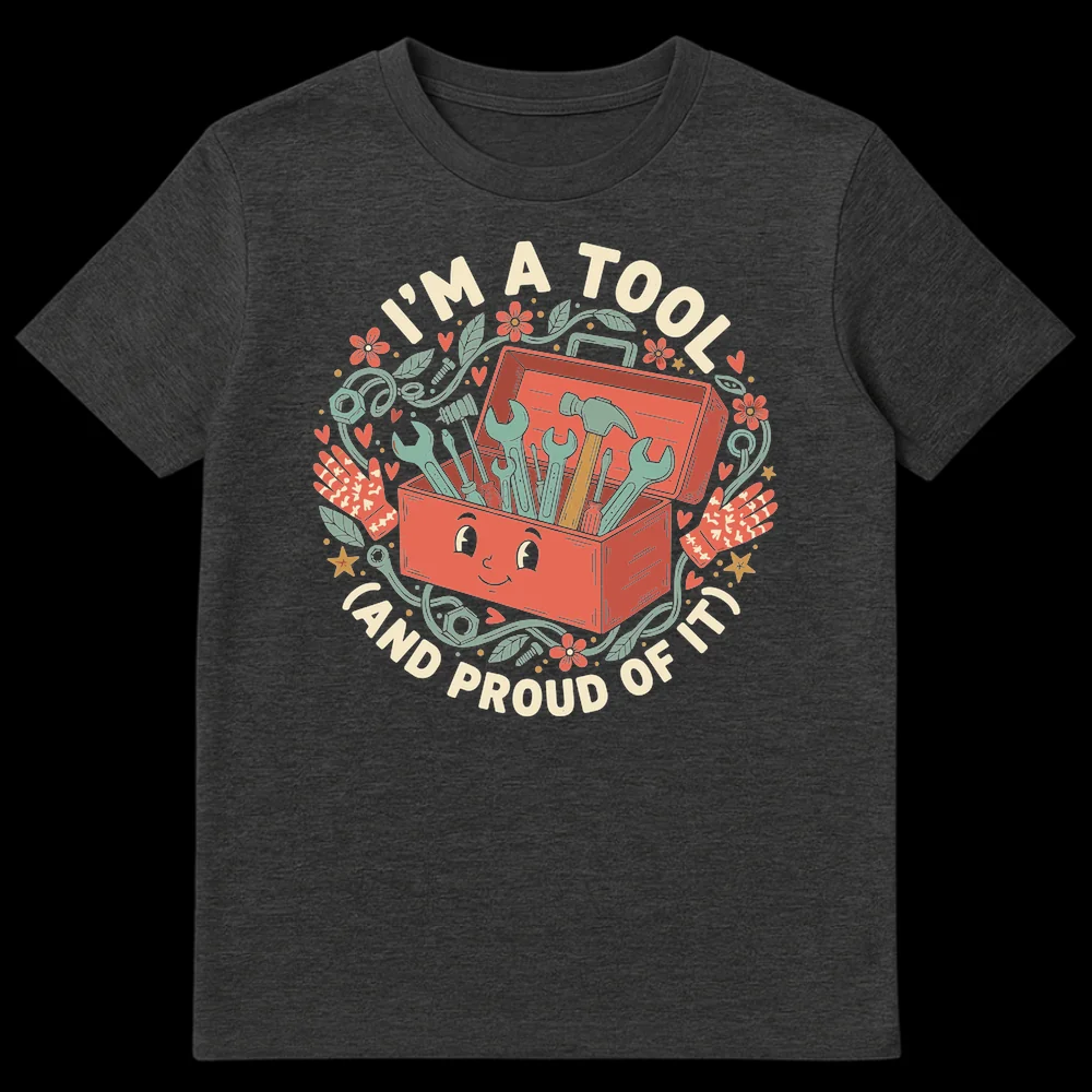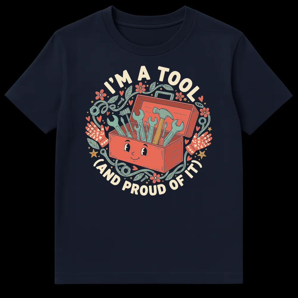 Embrace your inner handyman with our ‘I’M A TOOL (AND PROUD OF IT)’ t-shirt, featuring a retro-inspired, cheerful toolbox surrounded by classic hand tools. This design cleverly plays on the word ‘tool’ with a self-deprecating pun, making it a perfect conversation starter. It’s an ideal gift for DIY enthusiasts, mechanics, carpenters, or anyone with a great sense of humor.
