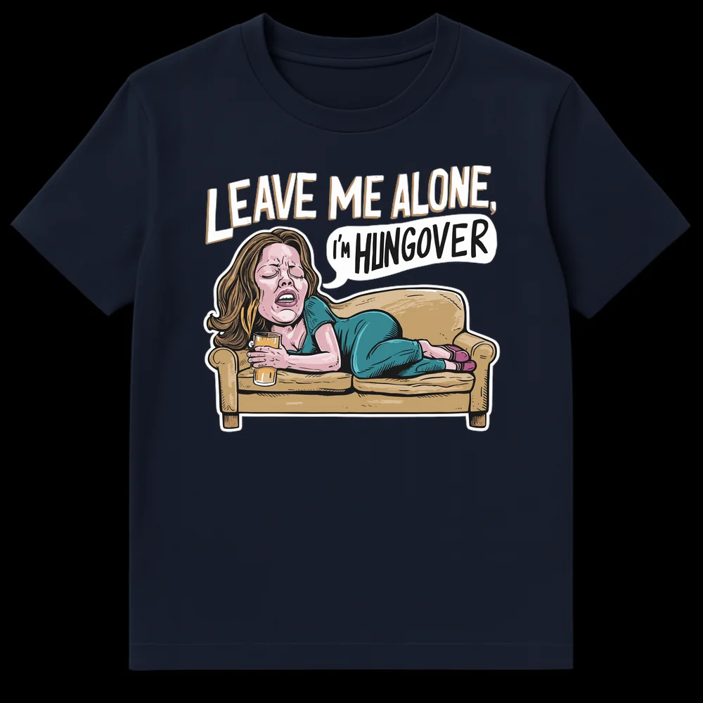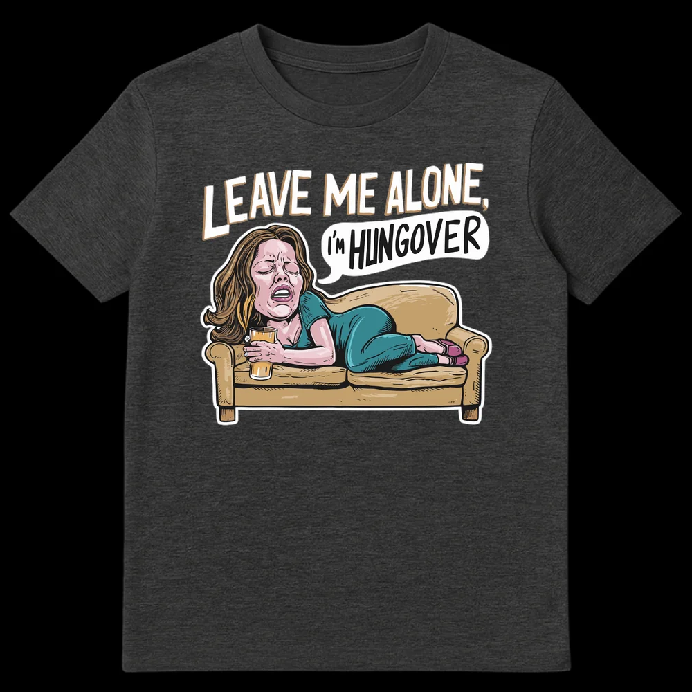Embrace your morning-after mood with our “LEAVE ME ALONE, I’M HUNGOVER” t-shirt. This design features a comically distressed woman on a couch, perfectly capturing the universal struggle of a hangover. It’s a relatable and self-deprecating statement piece, ideal for anyone who appreciates a good laugh about their party recovery. Perfect for friends who love to party, college students, or anyone needing peace after a big night out.