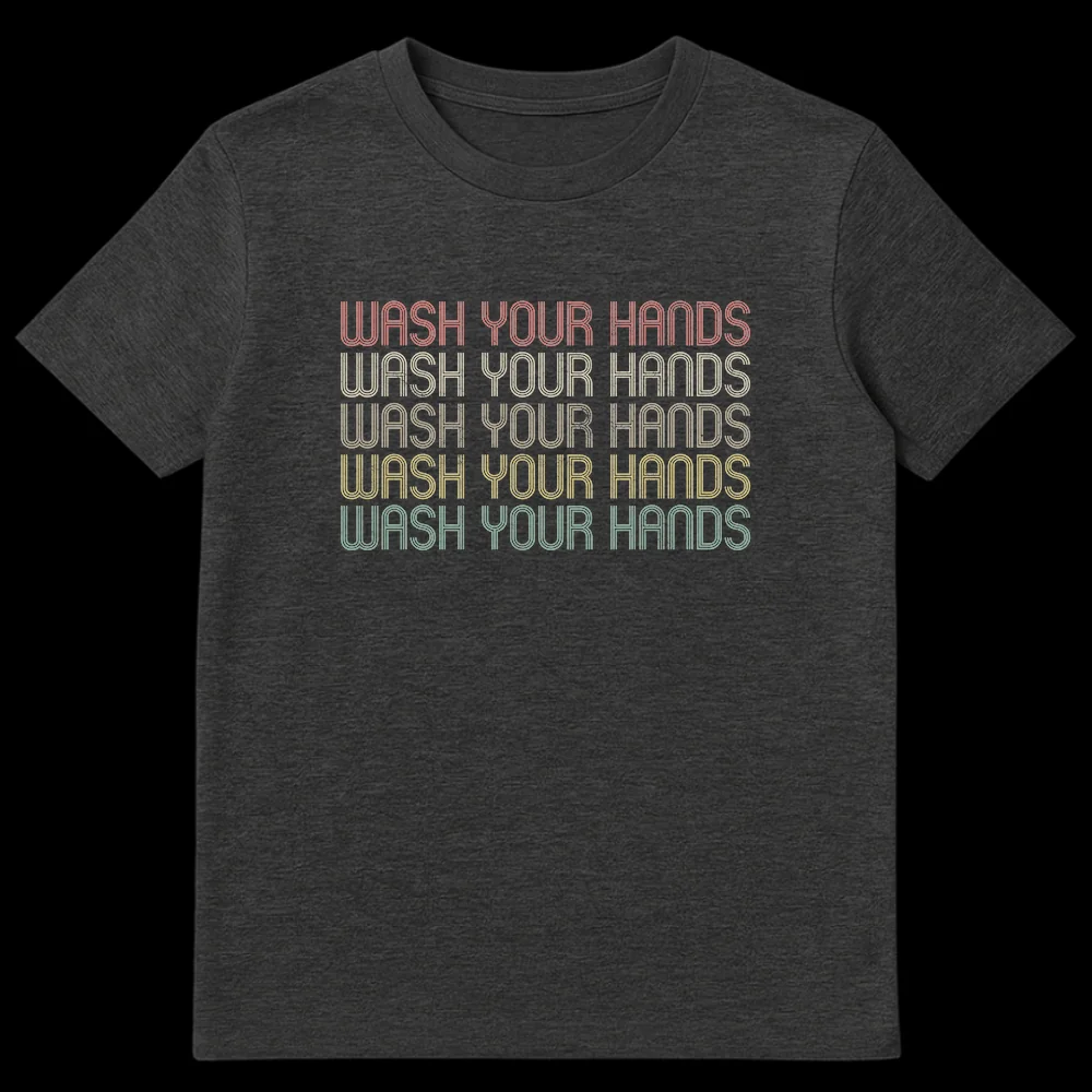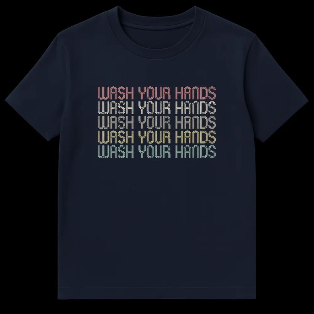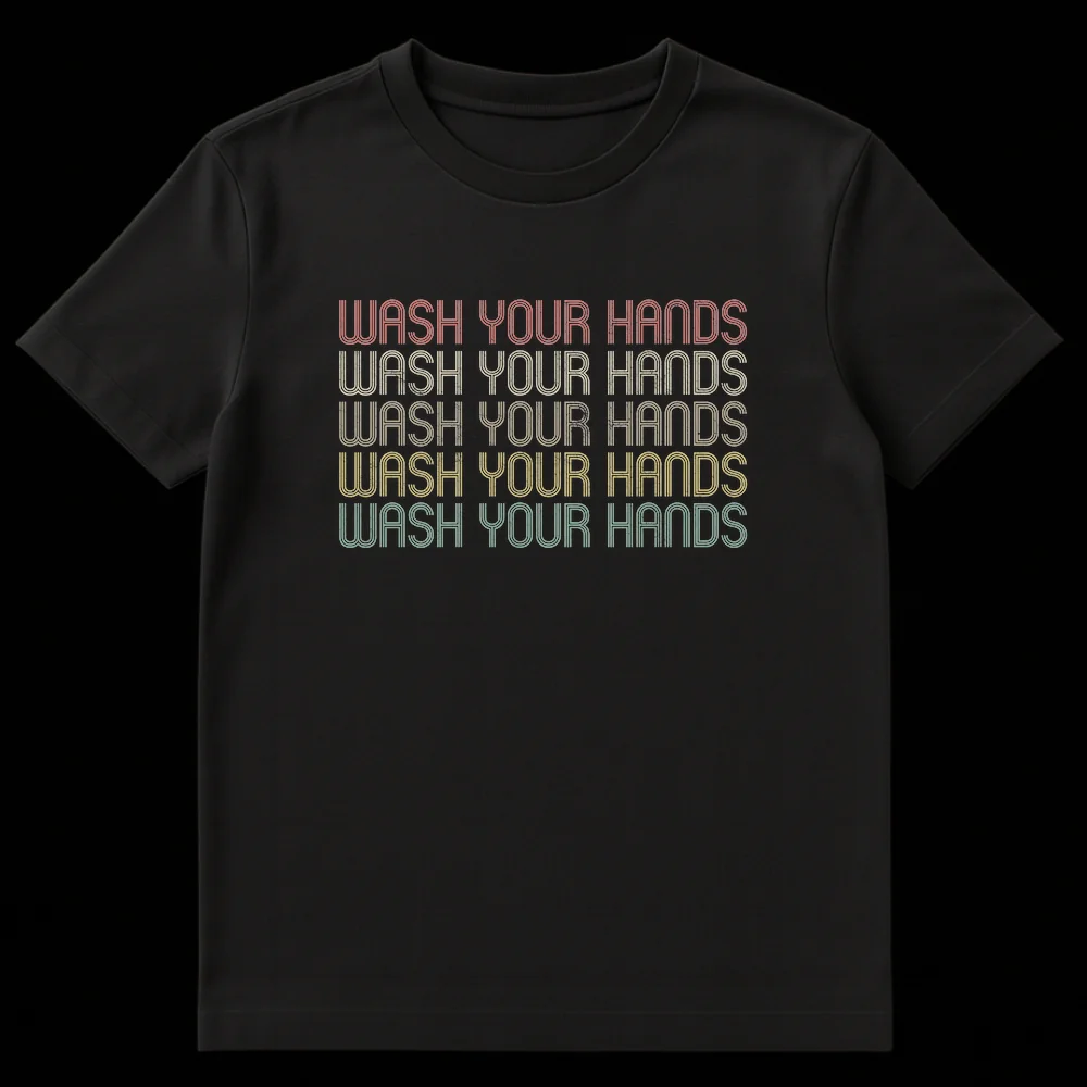 Embrace a timeless message with our ‘Wash Your Hands’ t-shirt, featuring a retro-inspired stacked text design. The repeated imperative, rendered in muted, earthy tones against black, offers a stylish yet direct nod to essential hygiene awareness. It’s a perfect subtle statement for anyone who values public health, appreciates vintage aesthetics, or seeks a thoughtful gift for a nurse, teacher, or health-conscious friend.