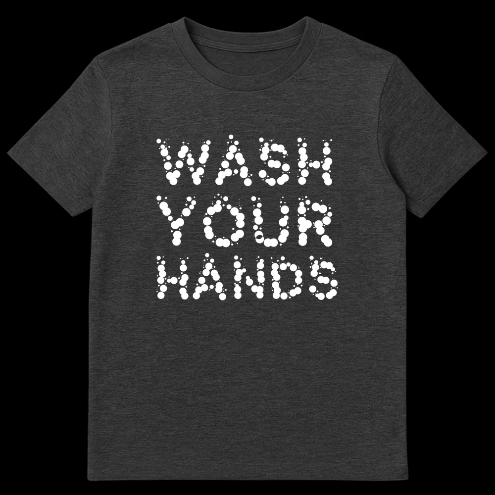 Champion cleanliness and public health with our eye-catching ‘WASH YOUR HANDS’ t-shirt. The design brilliantly transforms this vital message into a modern art piece, utilizing a distinctive bubble typography where each letter is formed by an array of circular shapes, reminiscent of effervescent soap suds or fresh water droplets. This isn’t just a shirt; it’s a stylish statement piece that promotes awareness of essential hygiene. The crisp white text against a classic black background offers a versatile, monochromatic aesthetic that easily pairs with any wardrobe. Beyond its visual appeal, this tee serves as a constant, gentle reminder for everyone to prioritize personal and community well-being. It’s an ideal gift for health-conscious individuals, essential workers, healthcare heroes, teachers, or any advocate for germ prevention. Wear your commitment to a healthier community with pride and contemporary flair.