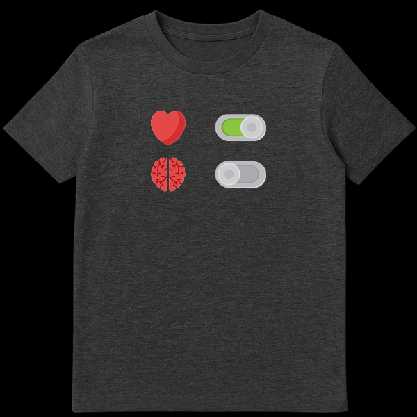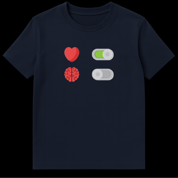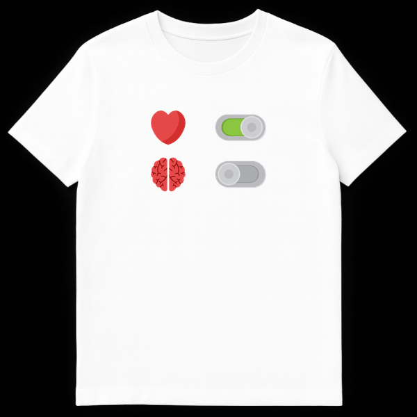 Embrace your intuitive side with our ‘Heart On, Brain Off’ t-shirt, a witty visual representation of following your passion instead of your logic. This minimal yet powerful design features a four-quadrant grid: a vibrant heart paired with a green ‘ON’ switch, sitting above a brain next to a greyed-out ‘OFF’ switch. It perfectly captures those moments when you decide to silence the analytical noise and just go with what feels right. Whether you are a hopeless romantic, a creative soul who hates overthinking, or just someone who values emotional intelligence, this shirt speaks your language. It makes a fantastic, humorous gift for Valentine’s Day, anniversaries, or for that friend who always follows their gut instinct.