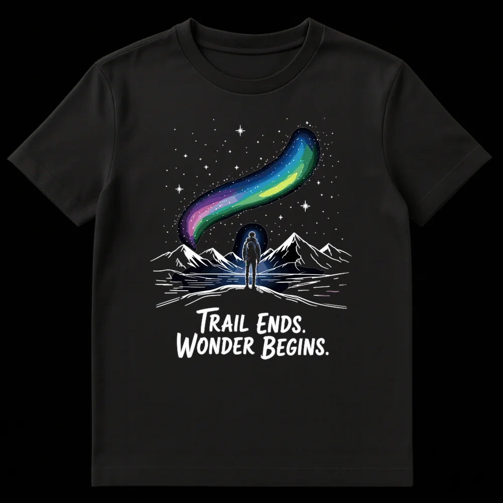 Embrace the magic of exploration with our “Trail Ends. Wonder Begins.” t-shirt. This design showcases a solitary hiker gazing at a breathtaking aurora-lit mountain landscape, perfectly capturing the awe of reaching a journey’s peak. It’s an ideal gift for outdoor enthusiasts, backpackers, and anyone who finds inspiration in nature’s grandeur and the cosmic unknown.